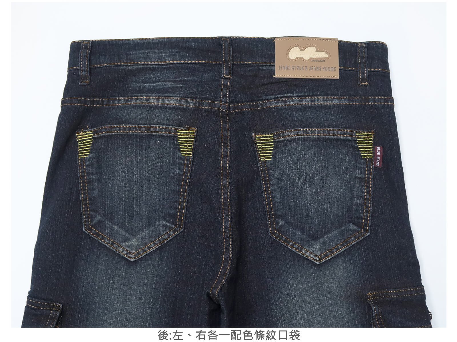 後:左、右各一配色條紋口袋。