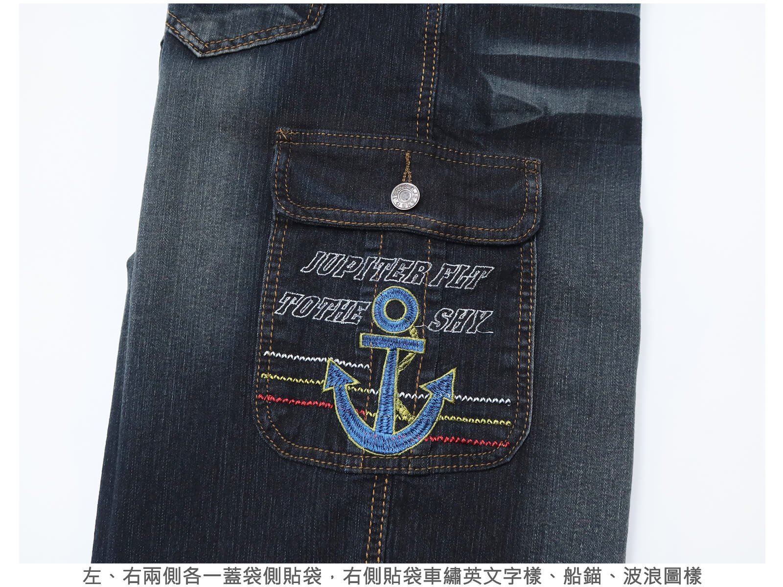 右側貼袋車繡英文字樣、船錨、波浪圖樣。