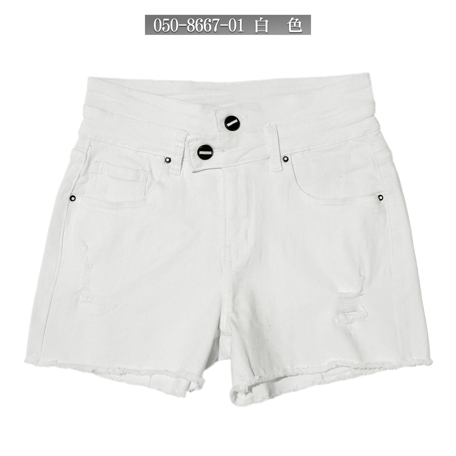 sun-e三分牛仔褲、不透明白色牛仔褲、中腰牛仔短褲、雙褲頭牛仔三分褲、鬚邊破洞熱褲、破褲、割破丹寧短褲、不修邊牛仔褲、涼爽顯瘦短褲、3 Inch Inseam White Denim Shorts、Non-See-Through White Jeans、Mid-rise Stretch Jean Shorts、double Waistband Jeans、Frayed Hem Of The Jeans、Slight Ripped Jeans、Cool And Slimming Womens Shorts (050-8657-01)白色 S M L XL (腰圍:66~84公分 / 26~33英吋) 女 [實體店面保障]
