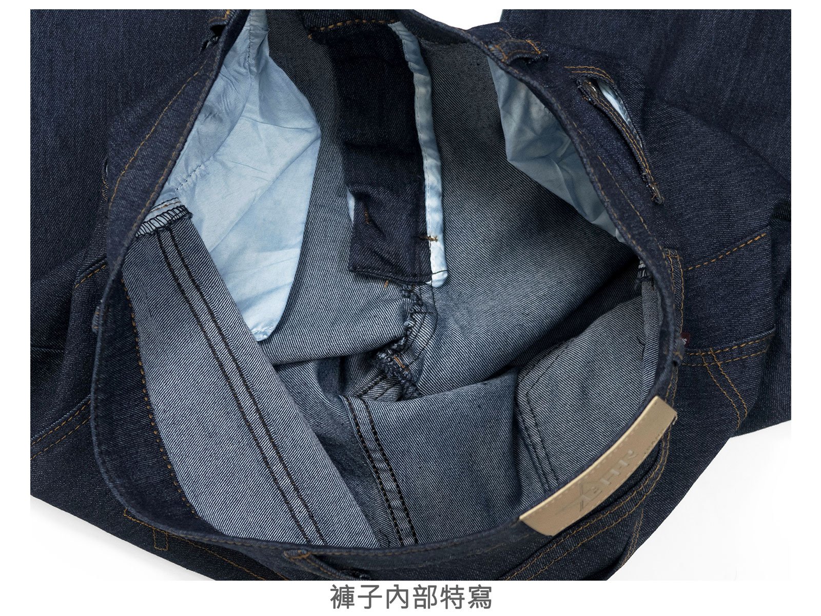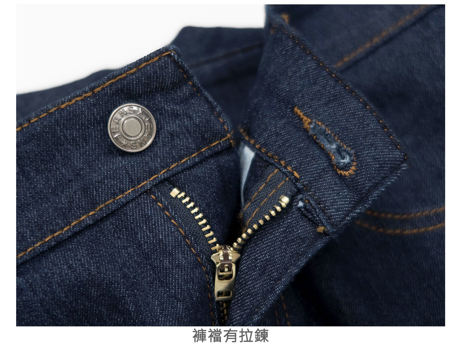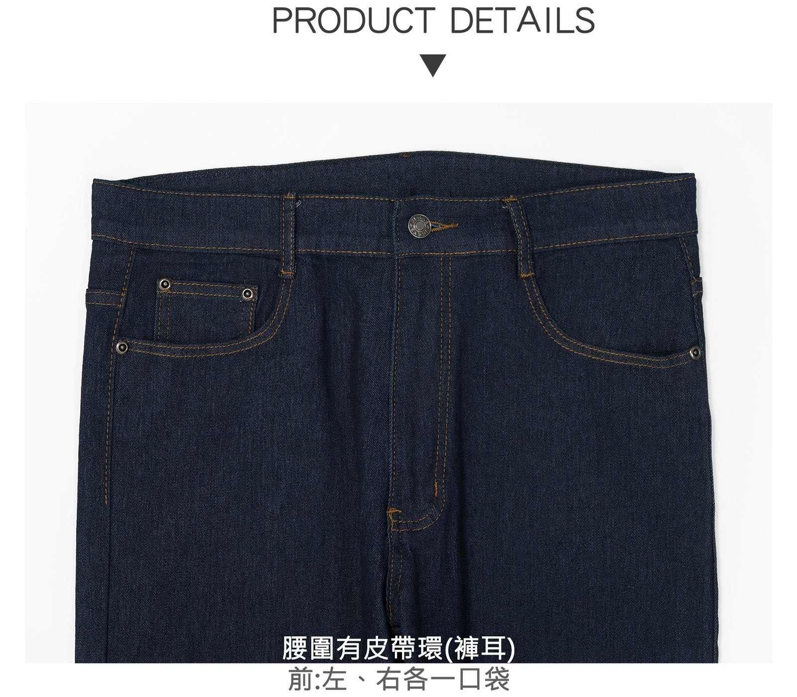 腰圍有皮帶環(褲耳)、褲檔有拉鍊。