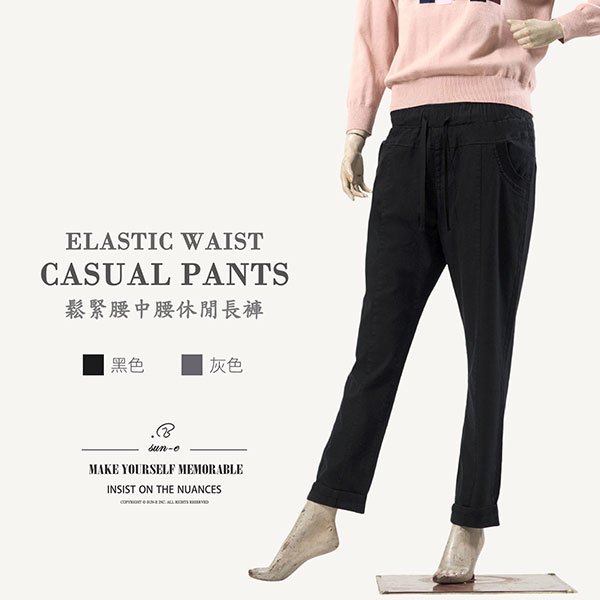 sun-e中腰休閒褲、彈力顯瘦長褲、全腰圍鬆緊帶修身長褲、黑色長褲、Mid-rise Casual Pants、Elastic Waist Pants (002-0066-21)黑色、(002-1067-22)灰色 M L (腰圍:26~36英吋/66~91公分) 女 [實體店面保障]