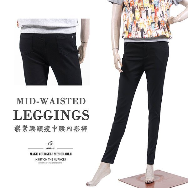 sun-e中腰內搭褲、素面黑色長褲、修身顯瘦內搭長褲、鬆緊腰彈性休閒長褲、合身版型休閒褲、Mid-Waisted Leggings、Elastic Waist Casual Pants (058-7729-21)黑色 S M L XL 2L(腰圍:26~35英吋 / 66~89公分) 女 [實體店面保障]