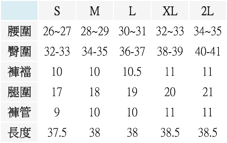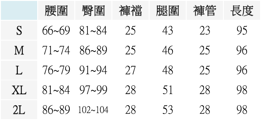 S ( 腰圍26-27英吋 / 66~69公分 ), M ( 腰圍28-29英吋 / 71~74公分 ), L ( 腰圍30-31英吋 / 76~79公分 ), XL ( 腰圍32-33英吋 / 81~84公分 ), 2L ( 腰圍34-35英吋 / 86~89公分 )