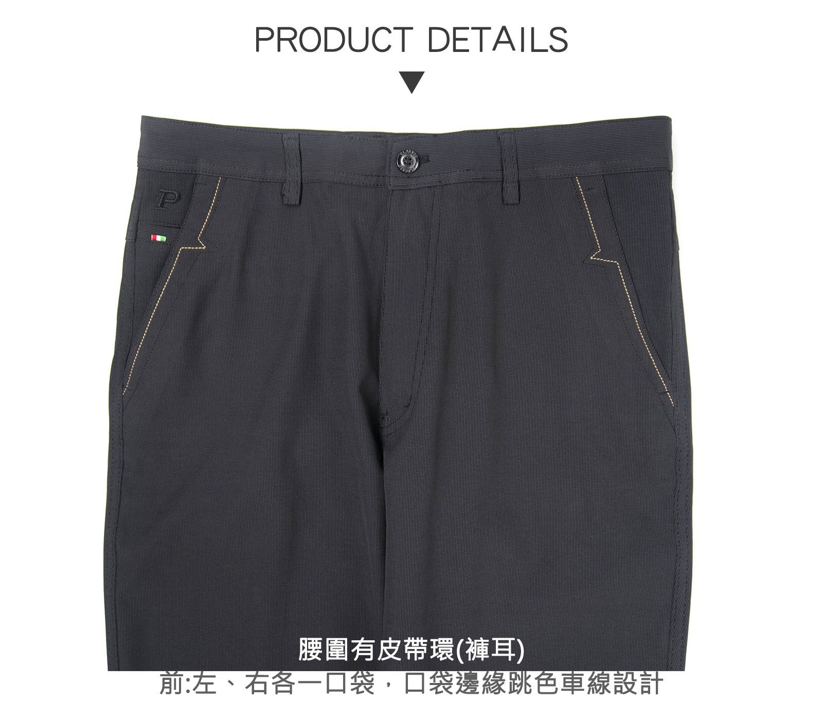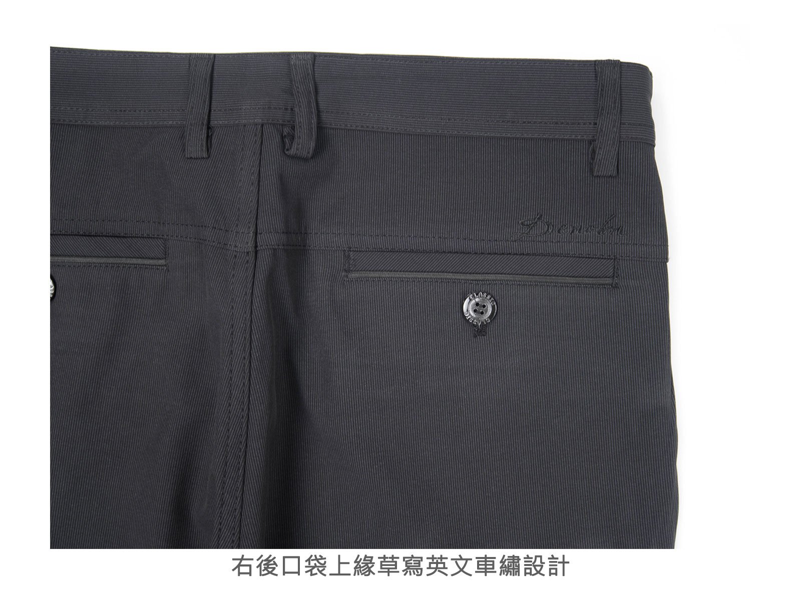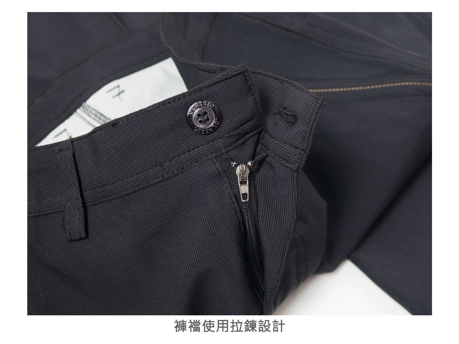 腰圍有皮帶環(褲耳)、褲檔使用拉鍊。