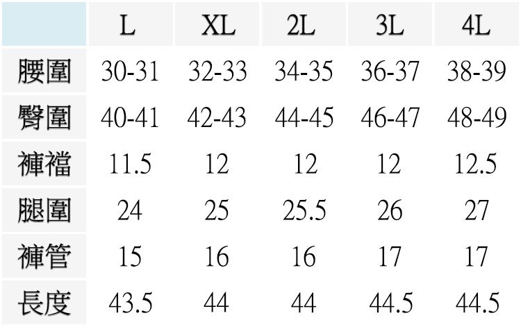 L ( 腰圍30-31英吋 / 76~79公分 ), XL ( 腰圍32-33英吋 / 81~84公分 ), 2L ( 腰圍34-35英吋 / 86~89公分 ), 3L ( 腰圍36-37英吋 / 91~94公分 ), 4L ( 腰圍38-39英吋 / 97~99公分 )