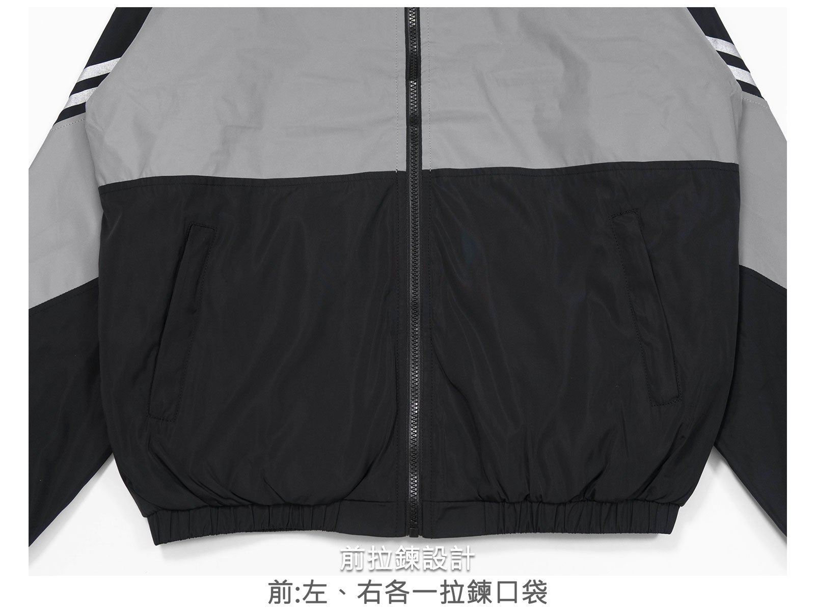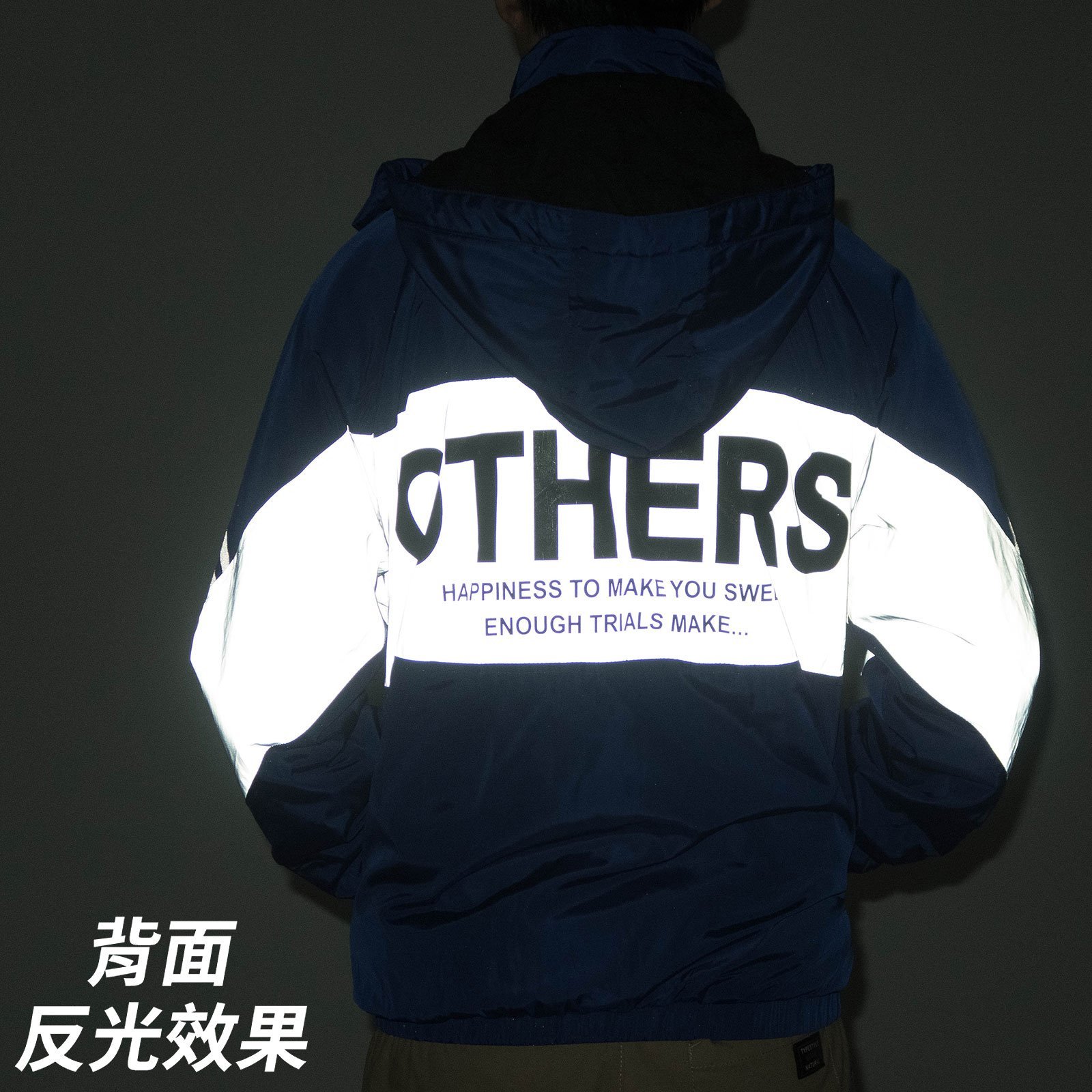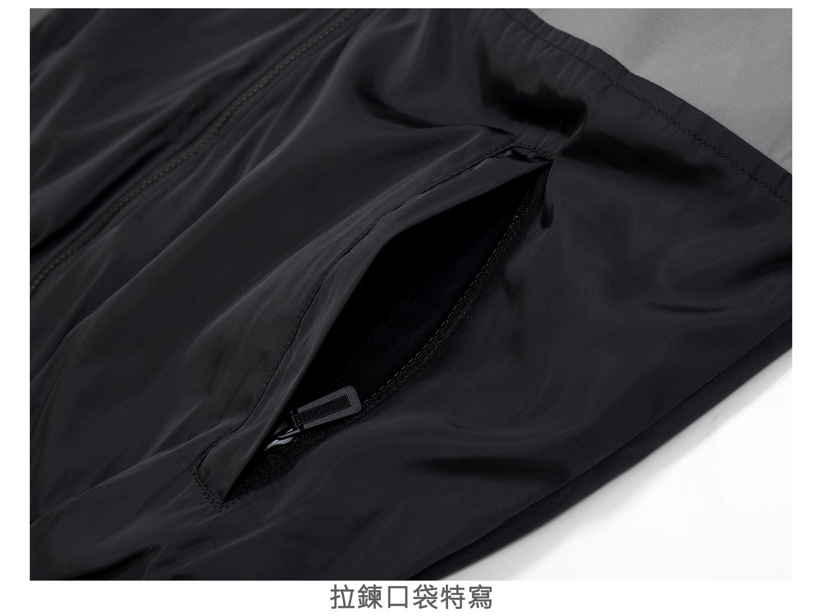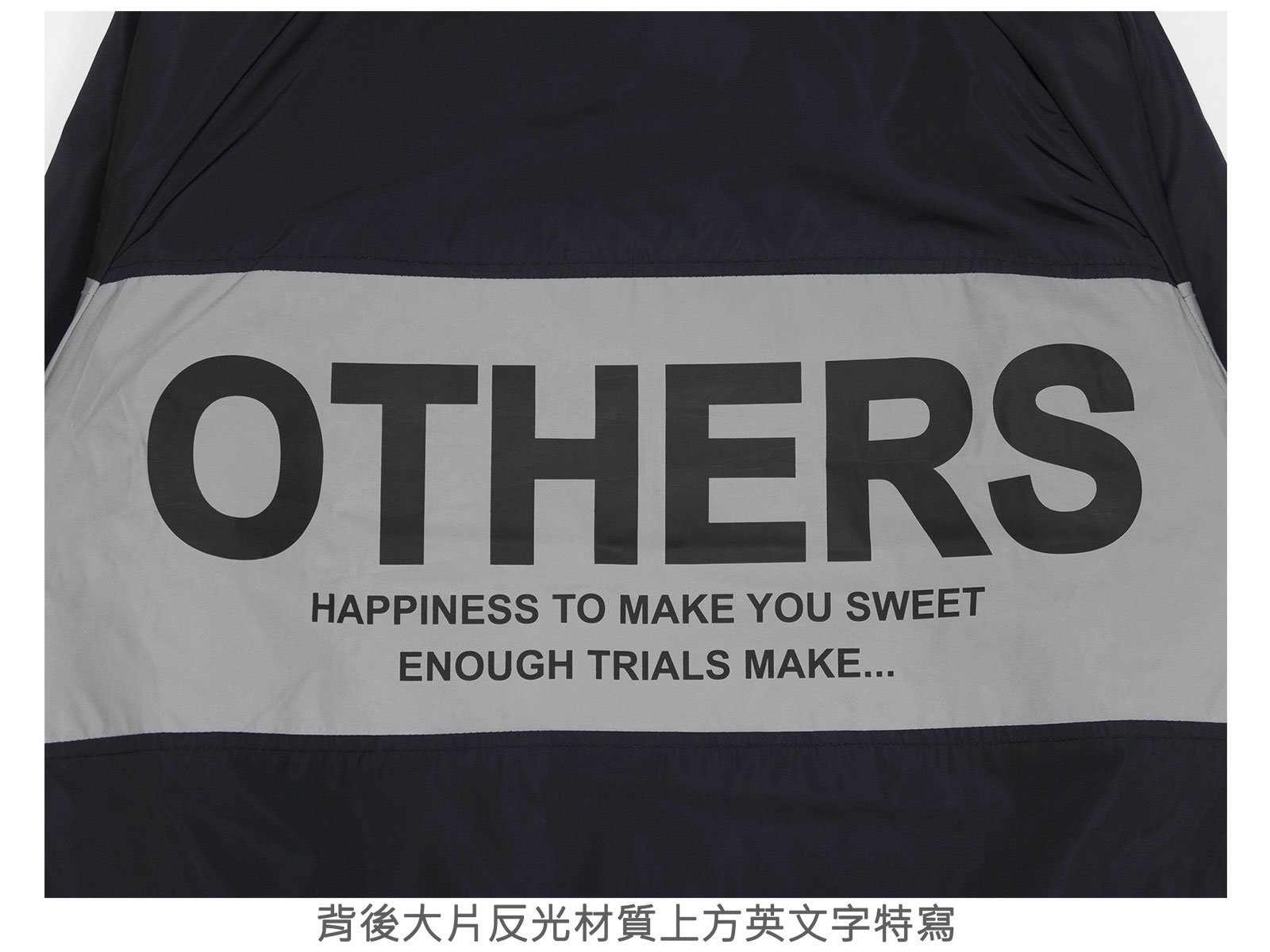胸口大片反光材質,配色剪接設計、左胸反光材質英文字。