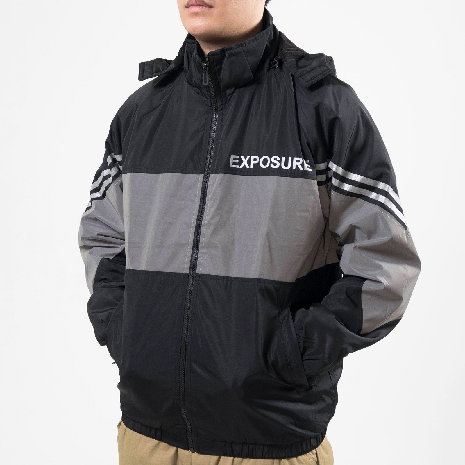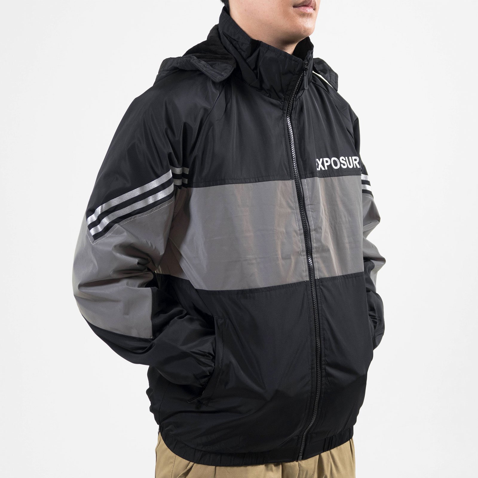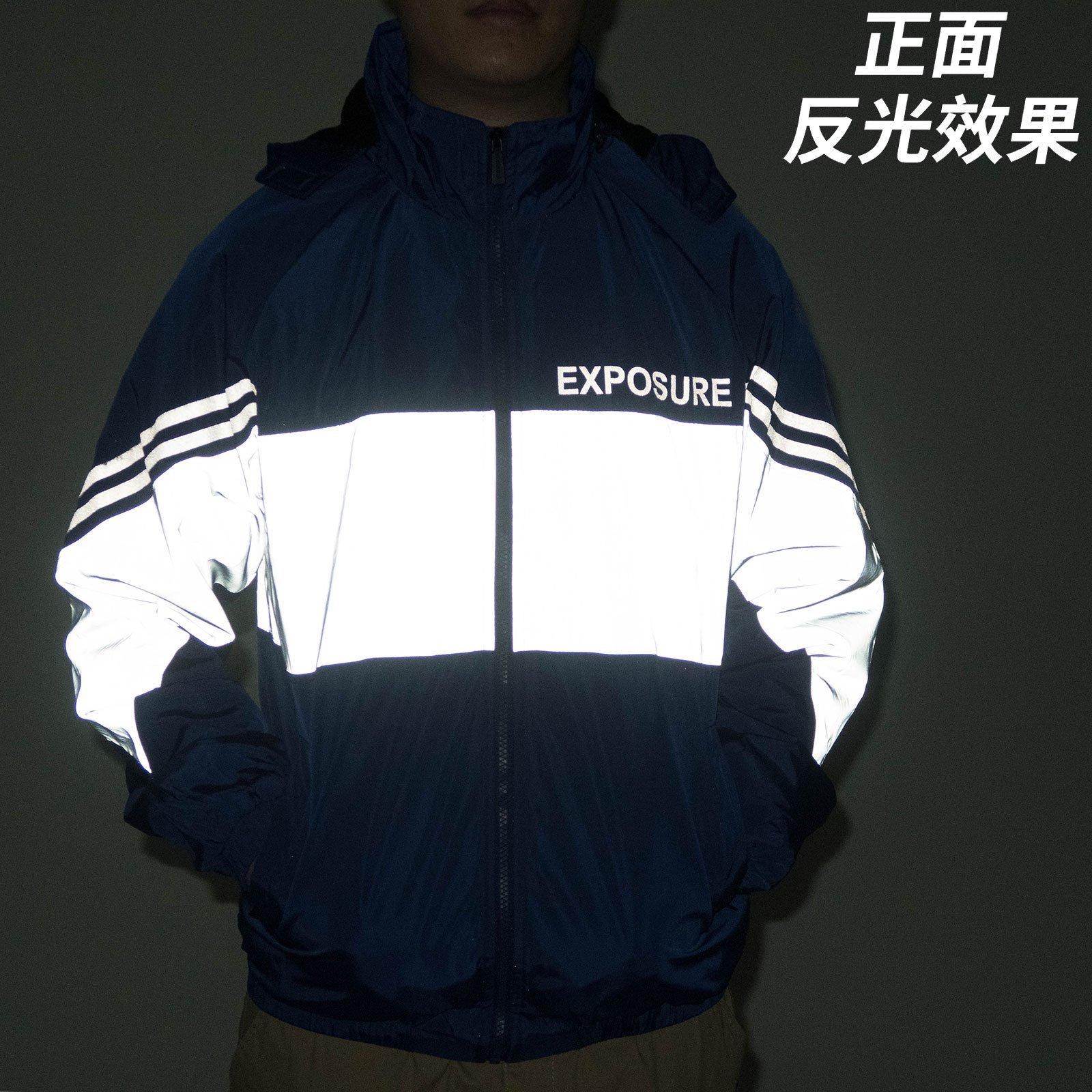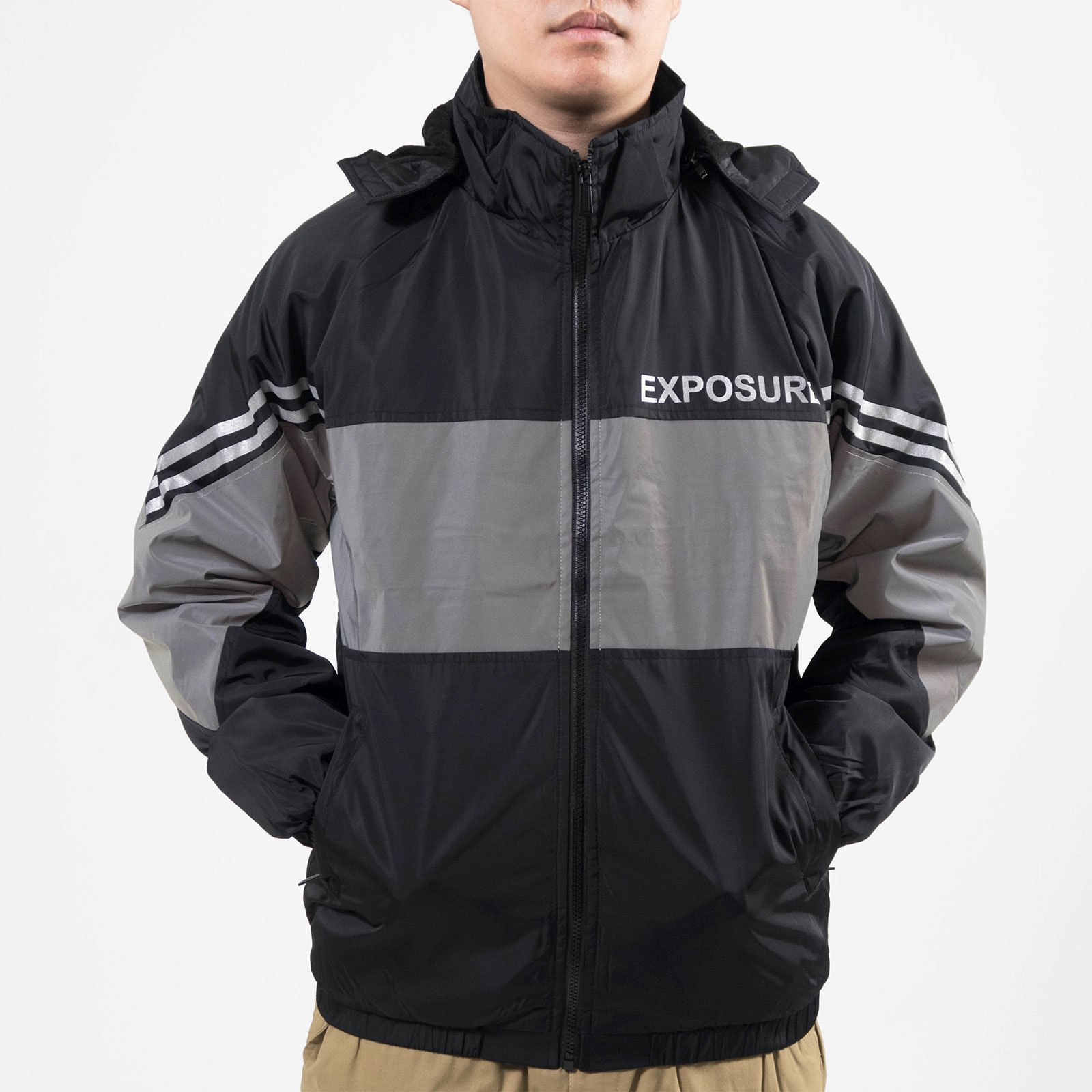 胸口大片反光材質,配色剪接設計、左胸反光材質英文字。