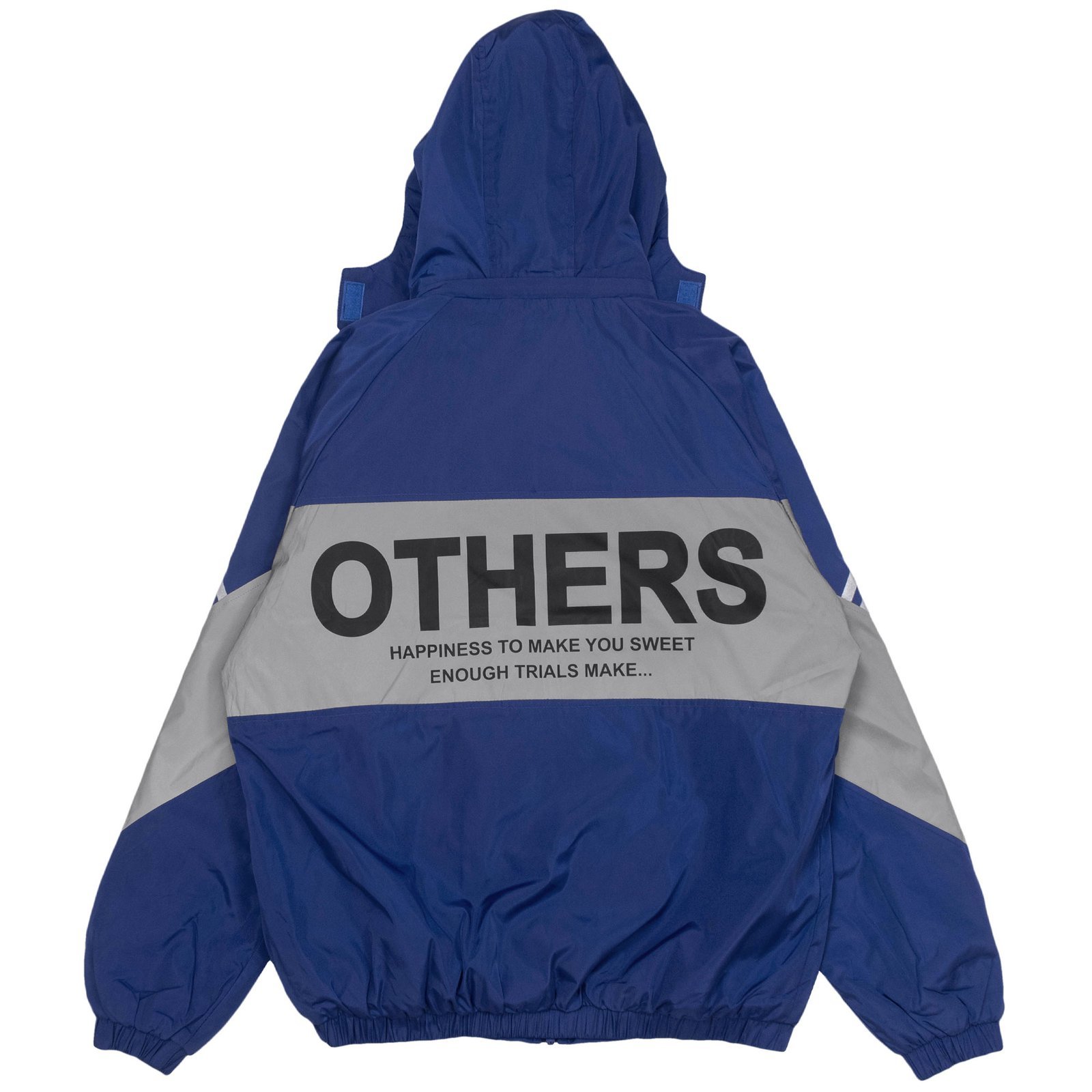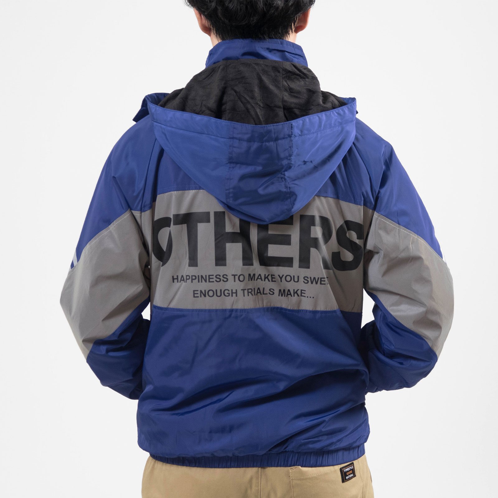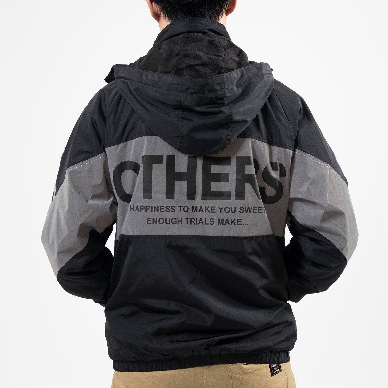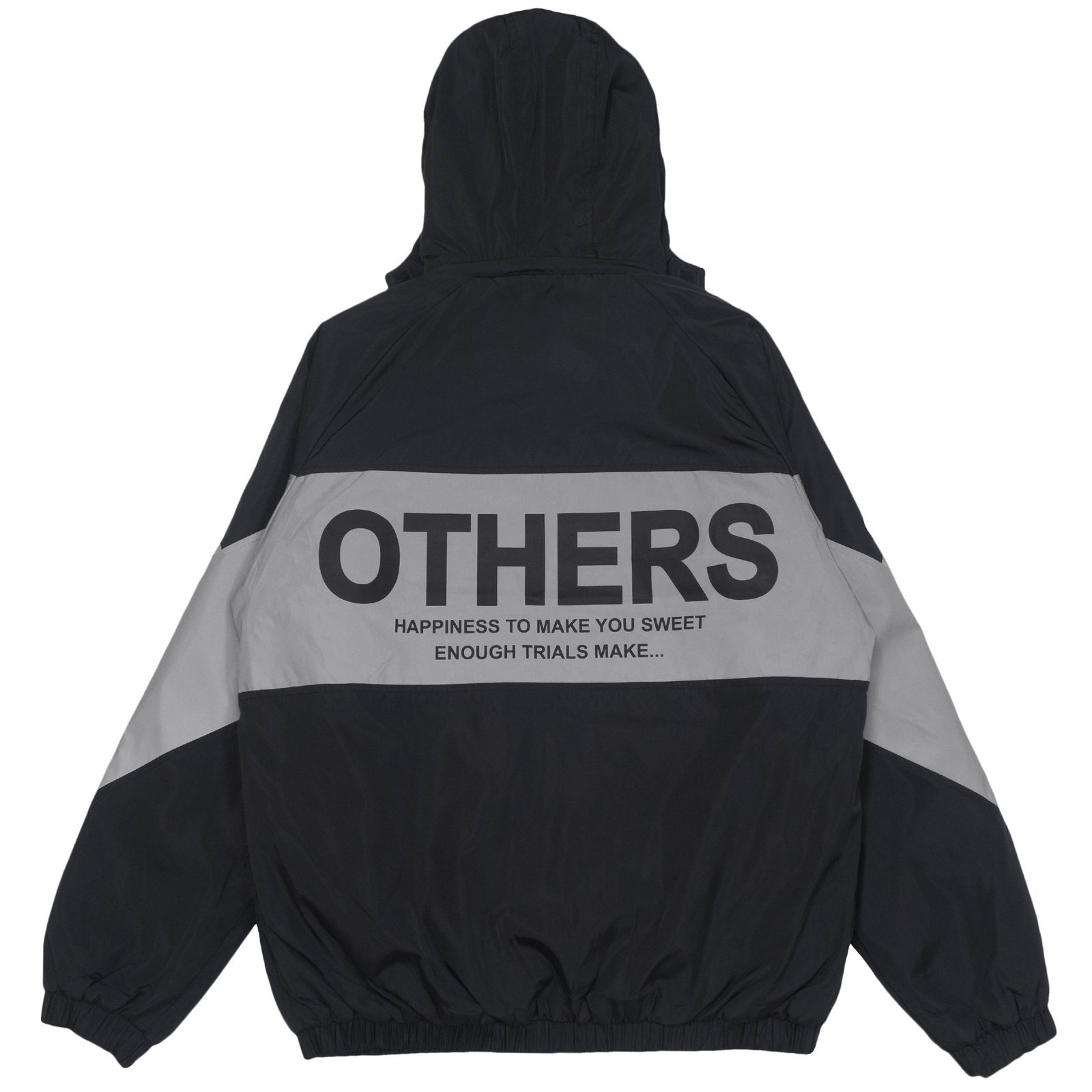 胸口大片反光材質,配色剪接設計、左胸反光材質英文字。