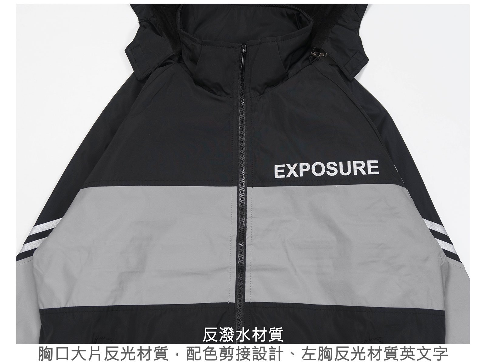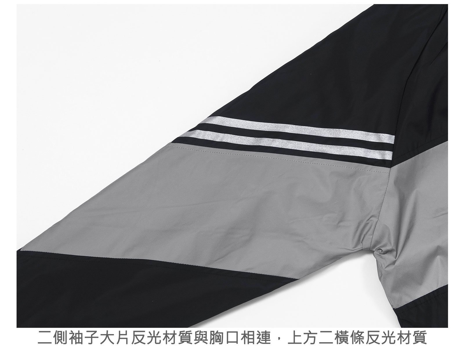 二側袖子大片反光材質與胸口相連,上方二橫條反光材質。