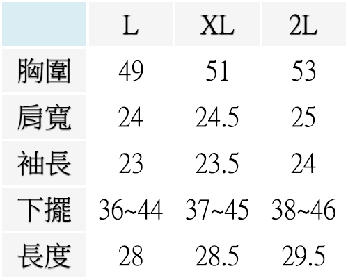 L ( 胸圍49英吋/124公分 ), XL ( 胸圍51英吋/130公分 ), 2L ( 胸圍53英吋/135公分 )