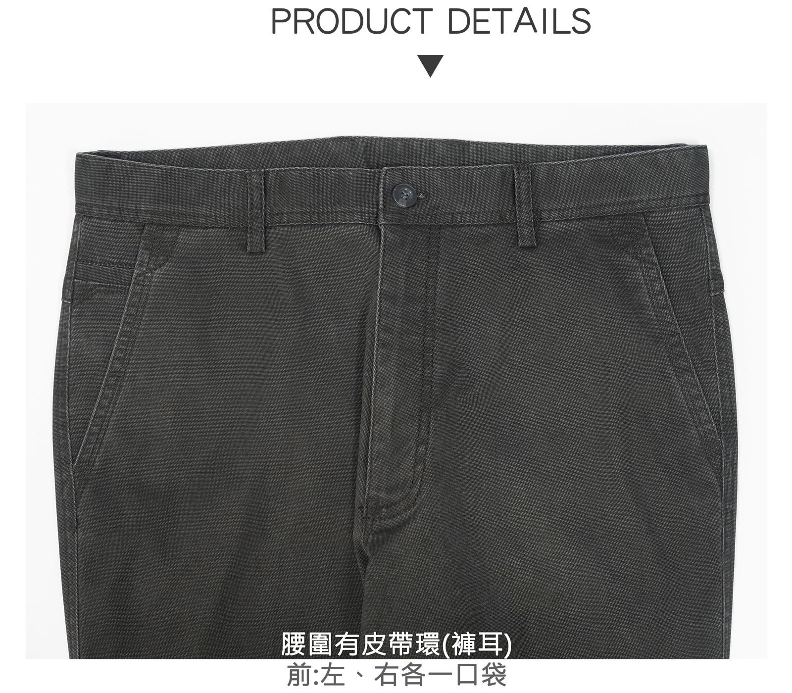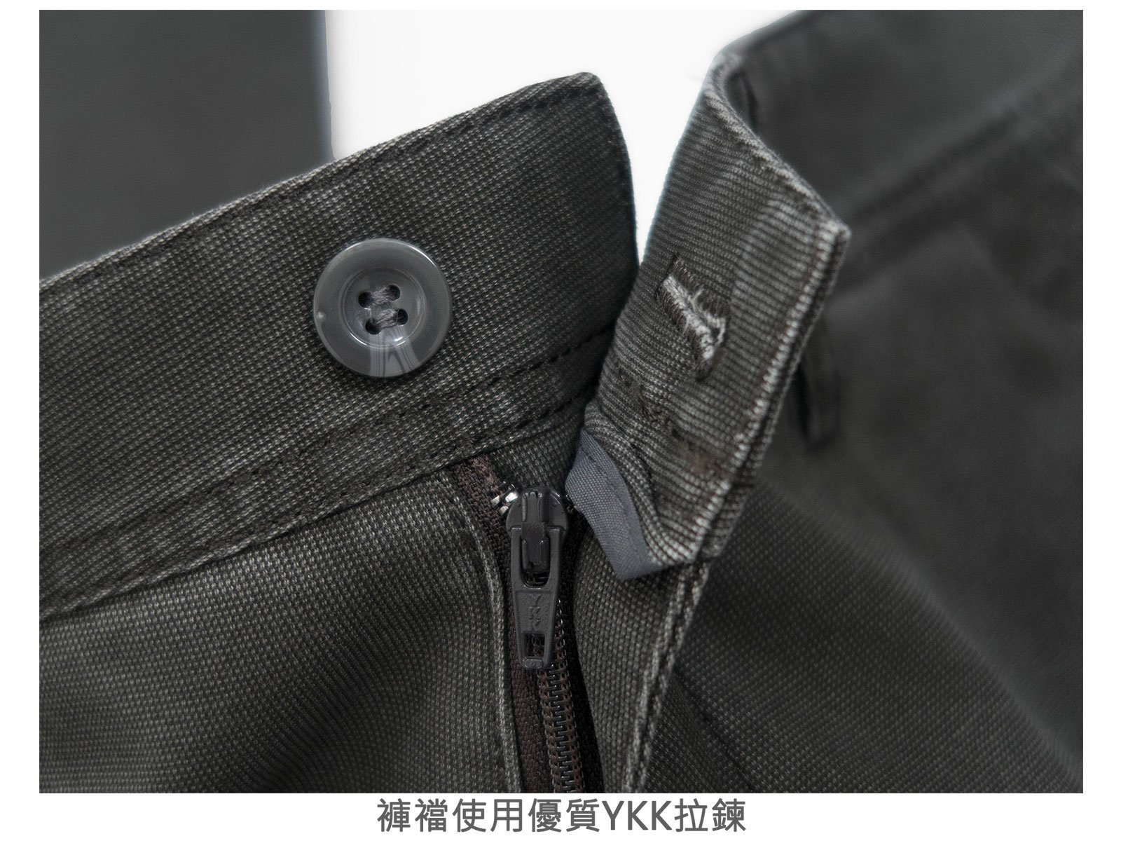 腰圍有皮帶環(褲耳)、褲檔使用優質YKK拉鍊。