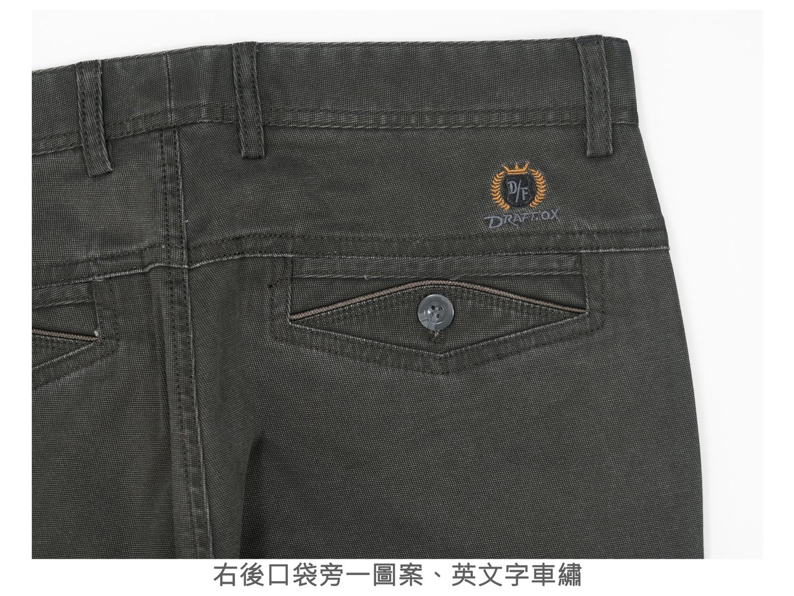 右後口袋旁一圖案、英文字車繡。