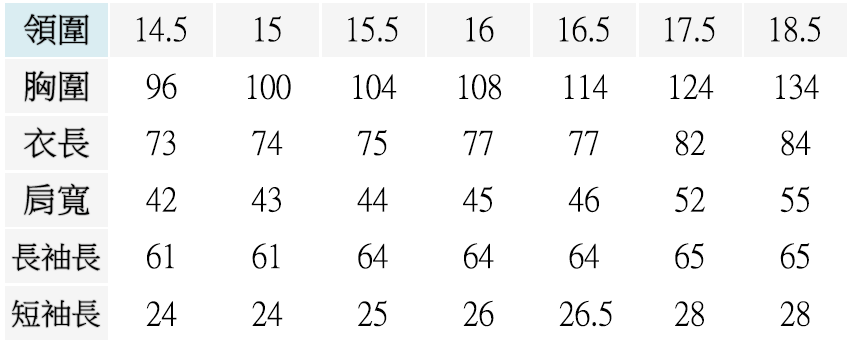 胸圍、衣長、肩寬、長袖長)、短袖長皆為公分