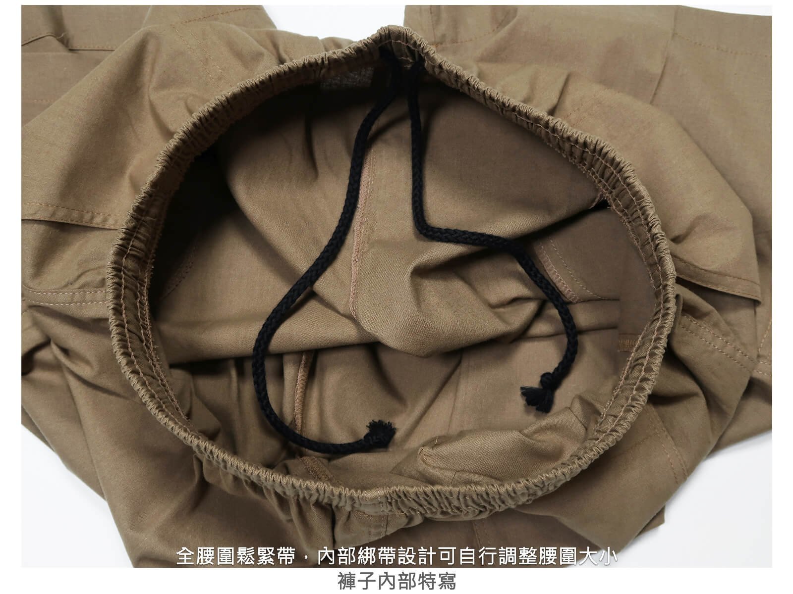全腰圍鬆緊帶,內部綁帶設計可自行調整腰圍大小。