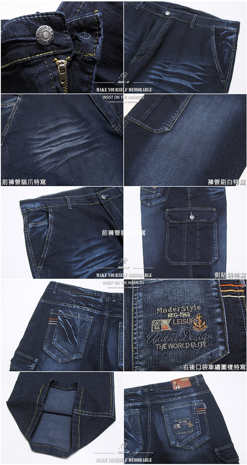 sun-e加大尺碼側貼袋牛仔工作褲、貓爪刷白彈性牛仔褲、多口袋工作長褲、車繡後口袋、CARGO PANTS、牛仔長褲、BIG&TALL JEANS (321-5206-21)深藍色 腰圍:40 42 44 46(英吋) [實體店面保障]
