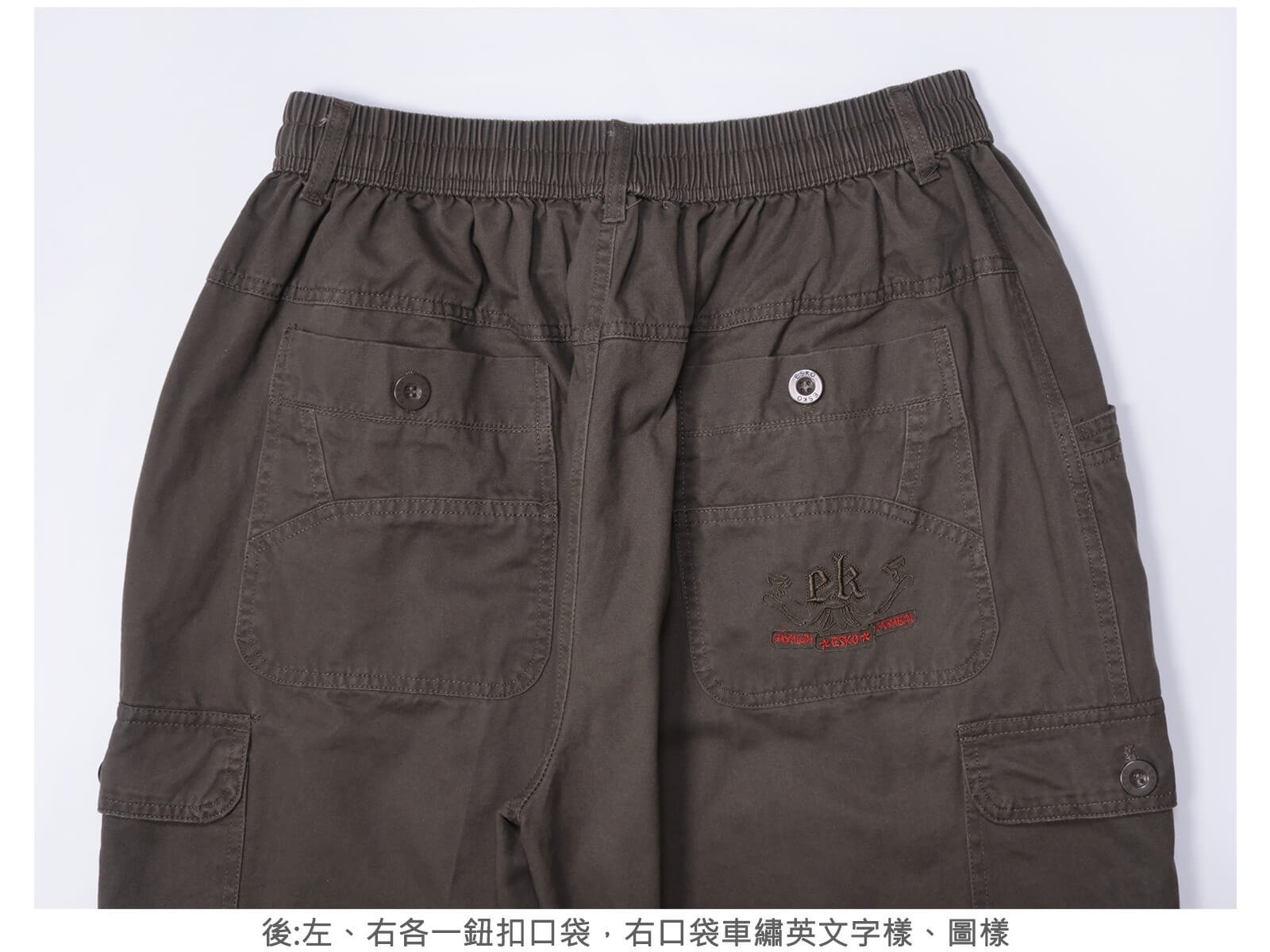 後:左、右各一鈕扣口袋,右口袋車繡英文字樣、圖樣。