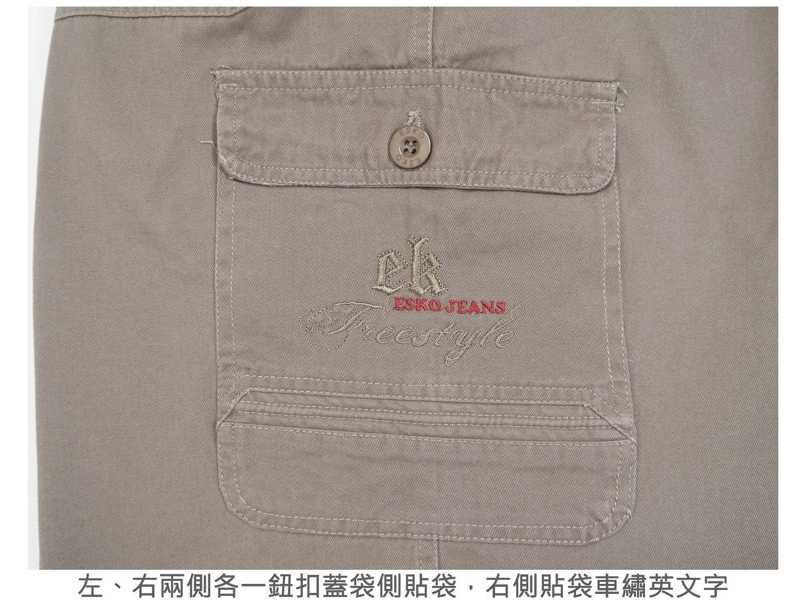 左、右二側各一鈕扣蓋袋側貼袋,右側貼袋車繡英文字。
