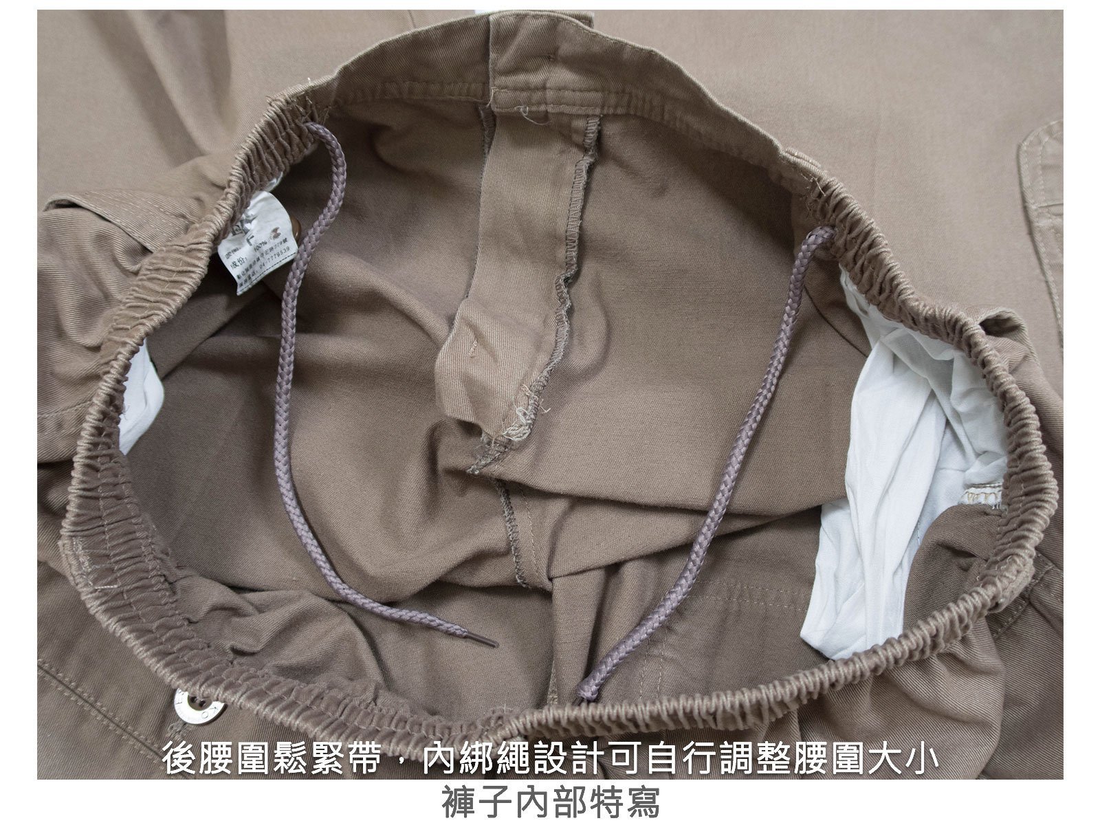 後腰圍鬆緊帶,內綁繩設計可自行調整腰圍大小。