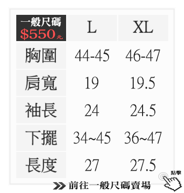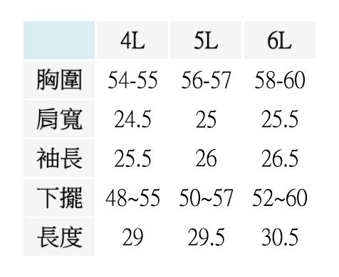 4L (胸圍:54-55英吋), 5L (胸圍:56-57英吋), 6L (胸圍:58-60英吋)