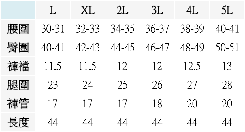 L (腰圍:30-31英吋), XL (腰圍:32-33英吋), 2L (腰圍:34-35英吋), 3L (腰圍:36-37英吋), 4L (腰圍:38-39英吋), 5L (腰圍:40-41英吋)