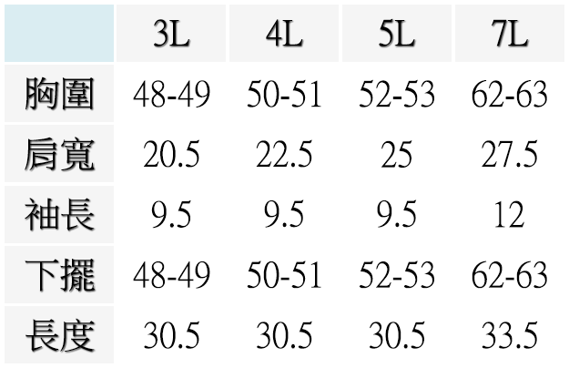 4L(胸圍50-51英吋), 5L(胸圍52-53英吋), 7L(胸圍62-63英吋), 3L(胸圍48-49英吋)