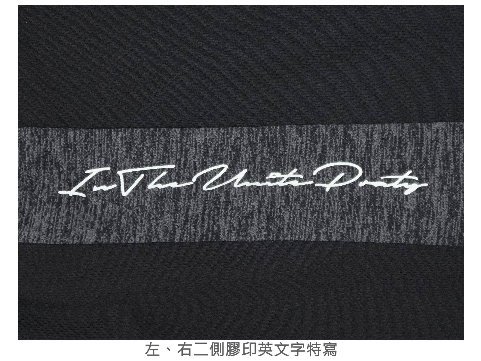 左、右二側膠印英文字紋理布料配色剪接。