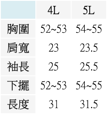 4L ( 胸圍52-53英吋 / 132~135公分 ), 5L ( 胸圍54-55英吋 / 137~140公分 )