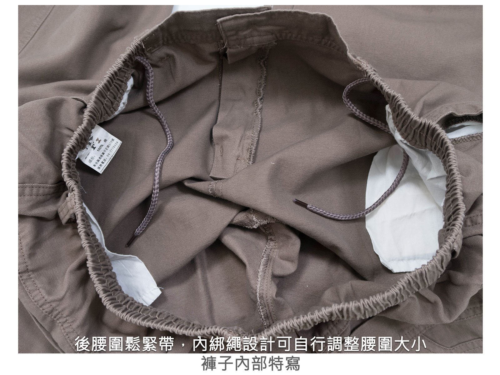 後腰圍鬆緊帶,內綁繩設計可自行調整腰圍大小。