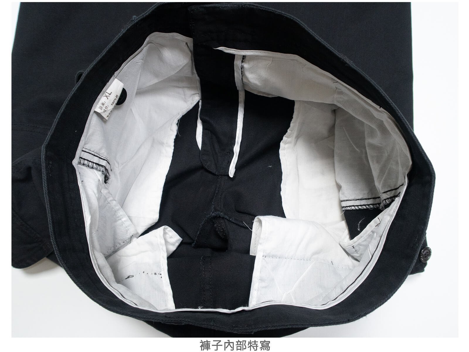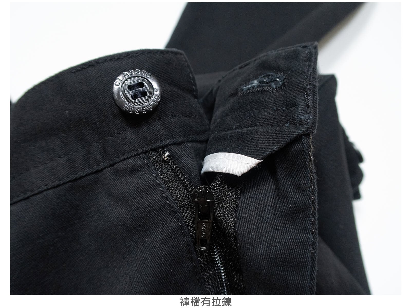 腰圍有皮帶環(褲耳),褲檔有拉鍊。