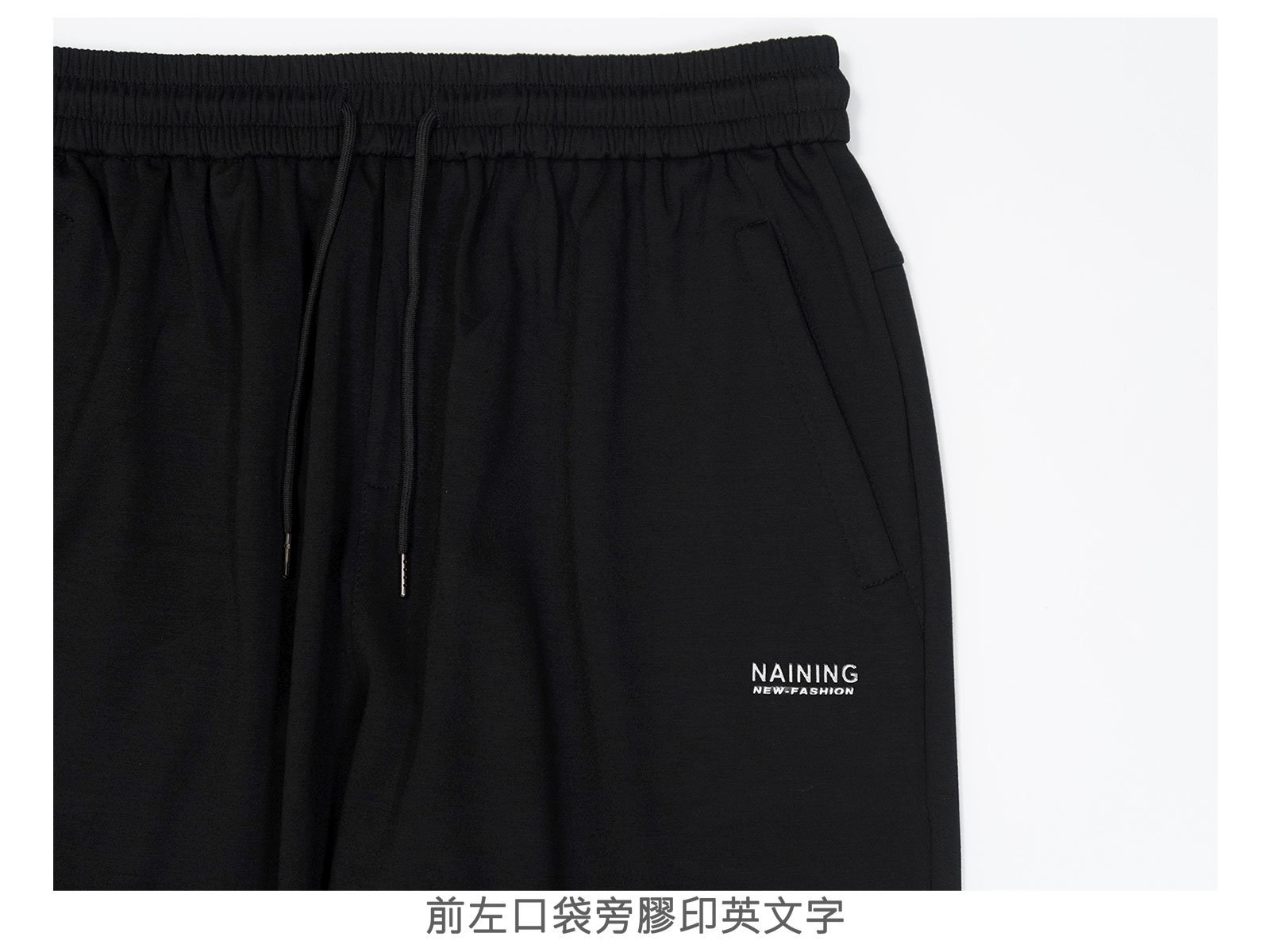 前:左、右各一拉鍊口袋,左口袋旁膠印英文字。