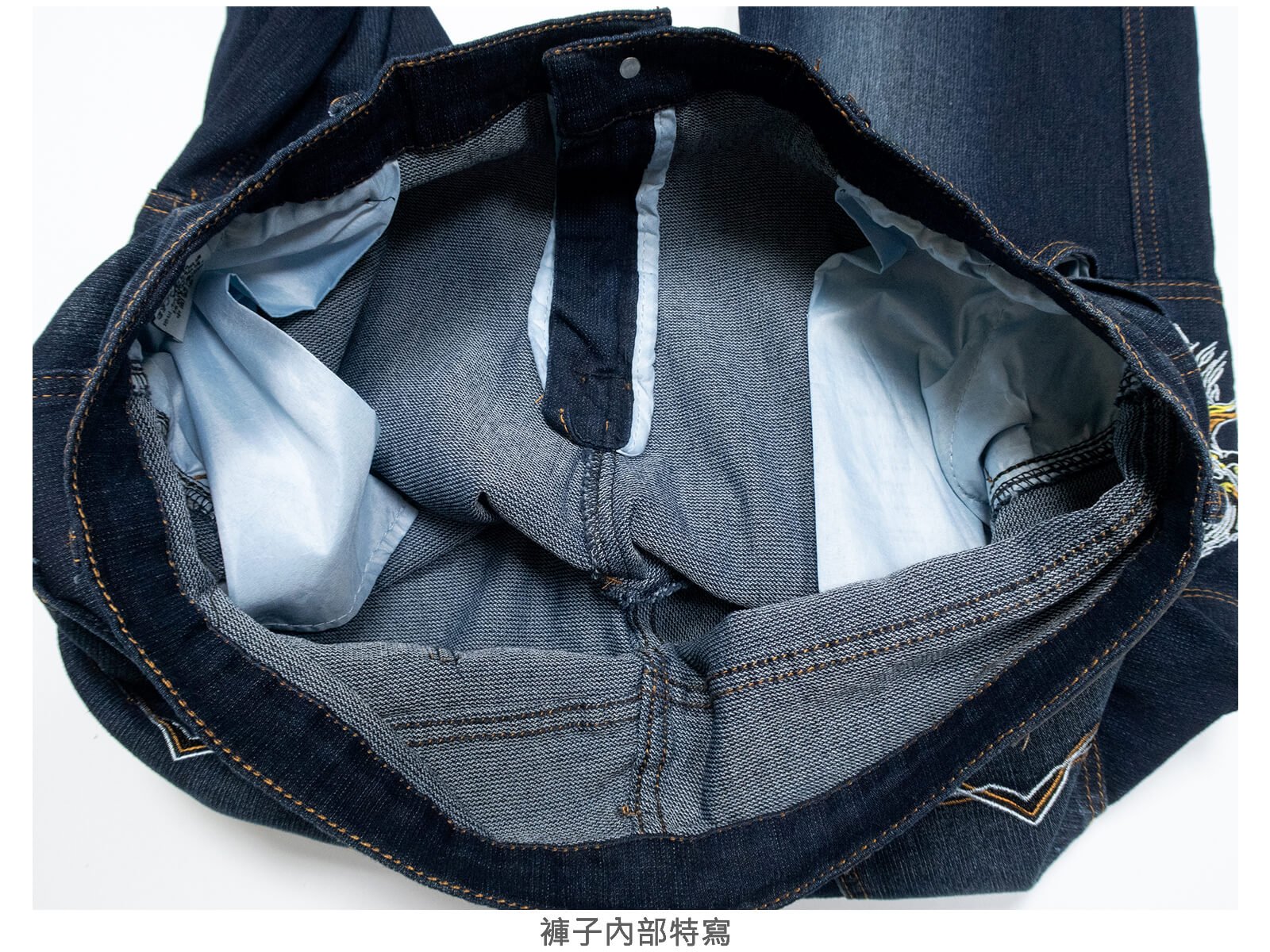 褲身刷白、貓爪處理,伸縮有彈性。
