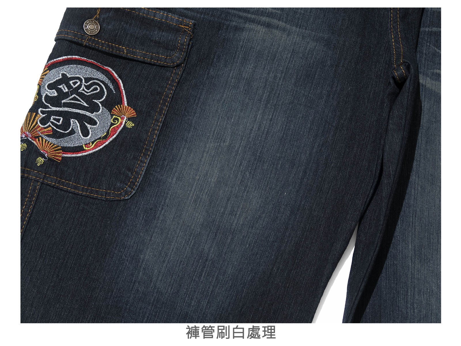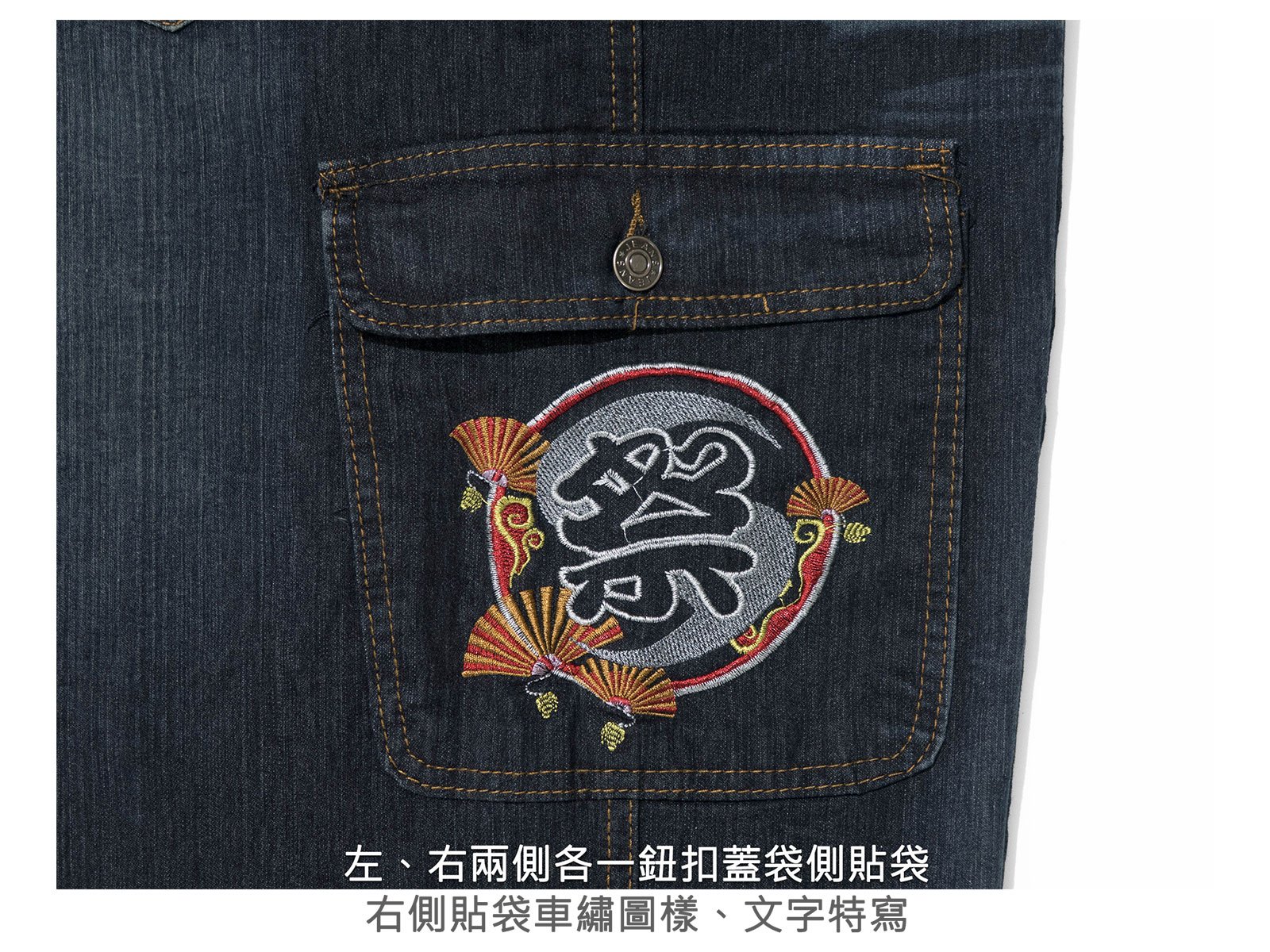 右側貼袋車繡日本風祭典字樣與扇子圖樣。