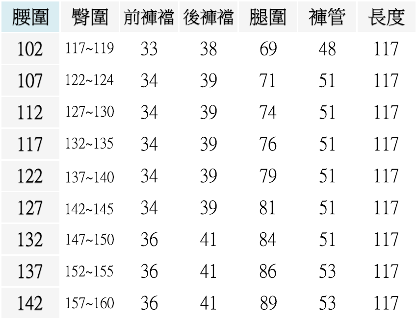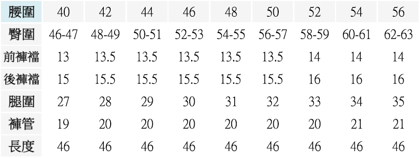 腰圍40英吋 / 102公分, 腰圍42英吋 / 107公分, 腰圍44英吋 / 112公分, 腰圍46英吋 / 117公分, 腰圍48英吋 / 122公分, 腰圍50英吋 / 127公分, 腰圍52英吋 / 132公分, 腰圍54英吋 / 137公分, 腰圍56英吋 / 142公分