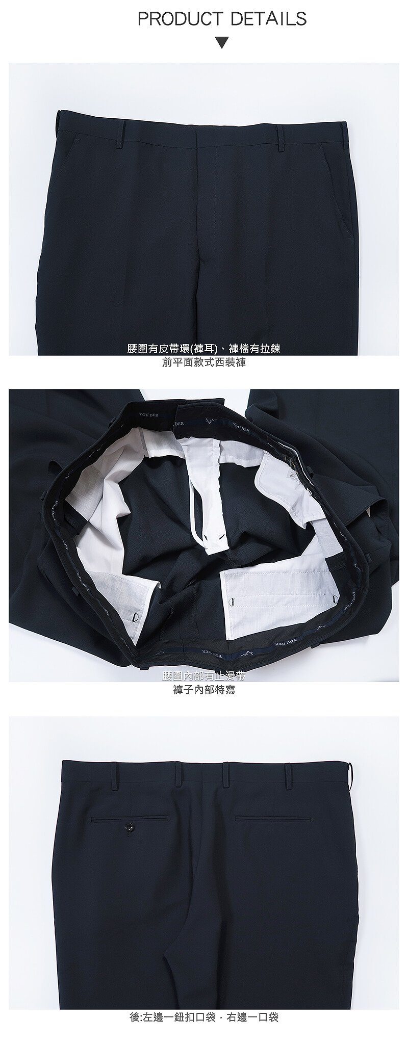 腰圍有皮帶環(褲耳),隱形鉤扣、鈕扣,褲檔使用優質YKK拉鍊。