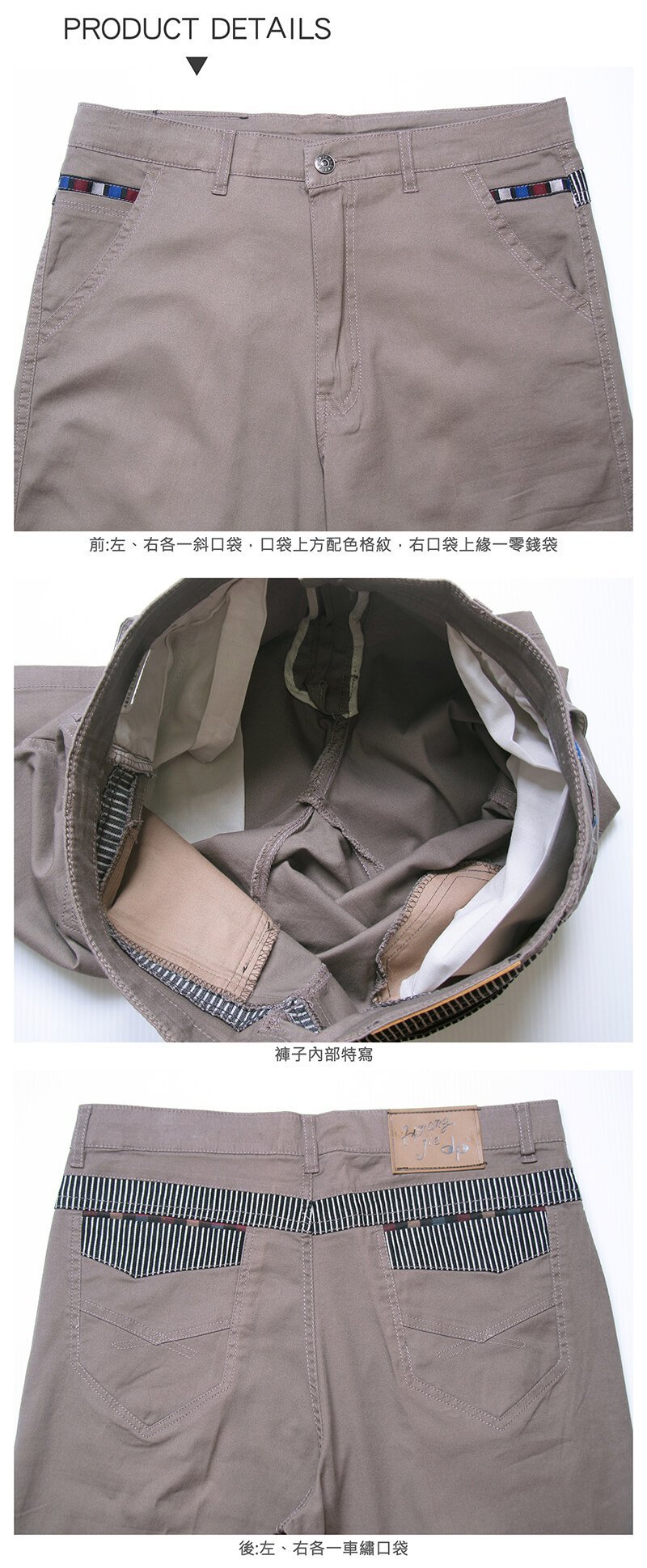後腰圍下方及口袋袋緣黑白條紋裝飾。