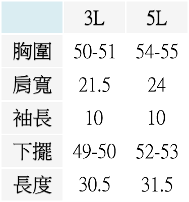 3L (胸圍50-51英吋), 5L (胸圍54-55英吋)
