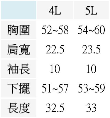4L ( 胸圍52~58英吋 / 132~147公分 ), 5L ( 胸圍54~60英吋 / 137~152公分 )