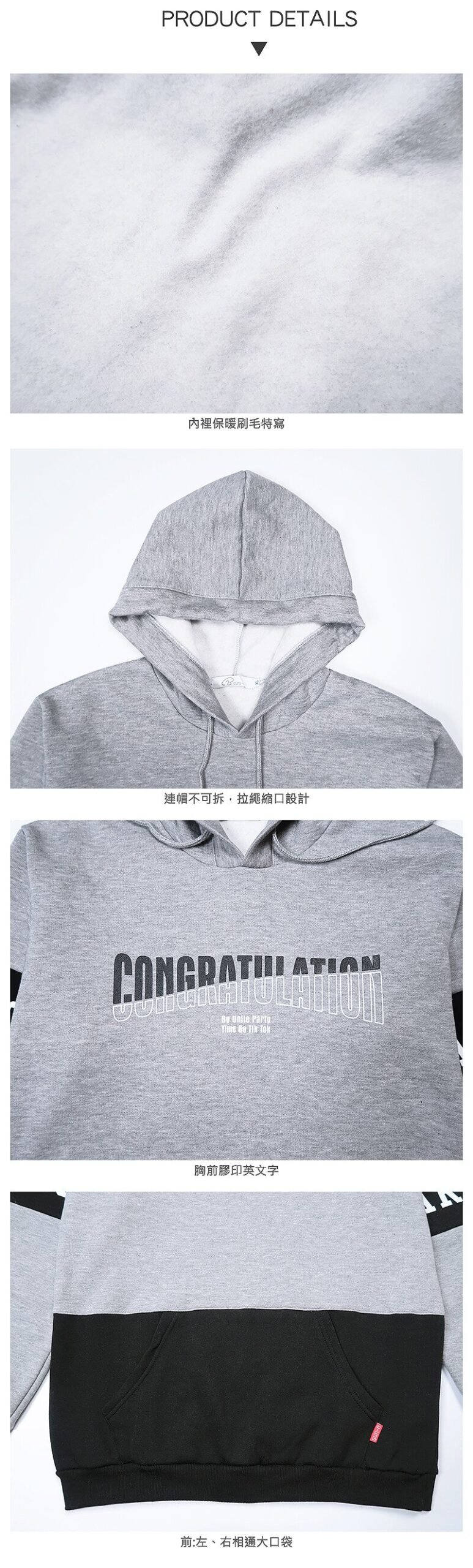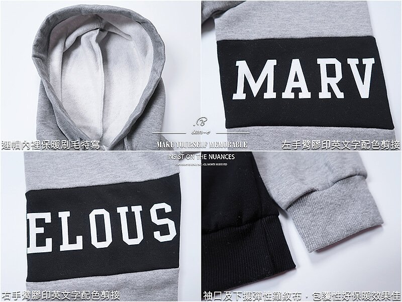 連帽不可拆,拉繩縮口設計,連帽內裡保暖刷毛。