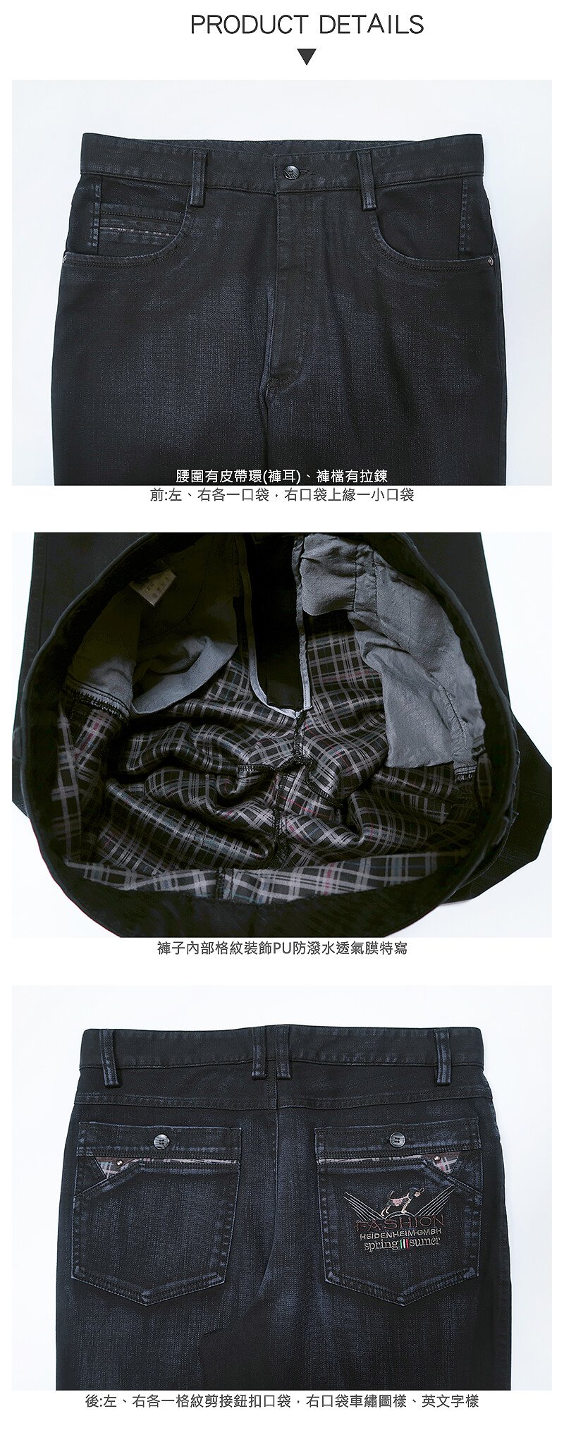 褲子內部PU防潑水透氣膜(格紋裝飾)。