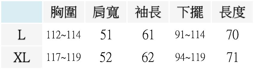 L ( 胸圍44-45英吋 / 112~114公分 ), XL ( 胸圍46-47英吋 / 117~119公分 )