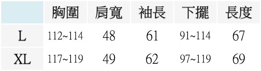 L ( 胸圍44-45英吋 / 112~114公分 ), XL ( 胸圍46-47英吋 / 117~119公分 )