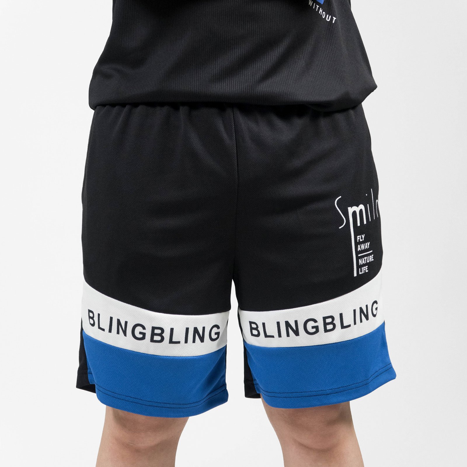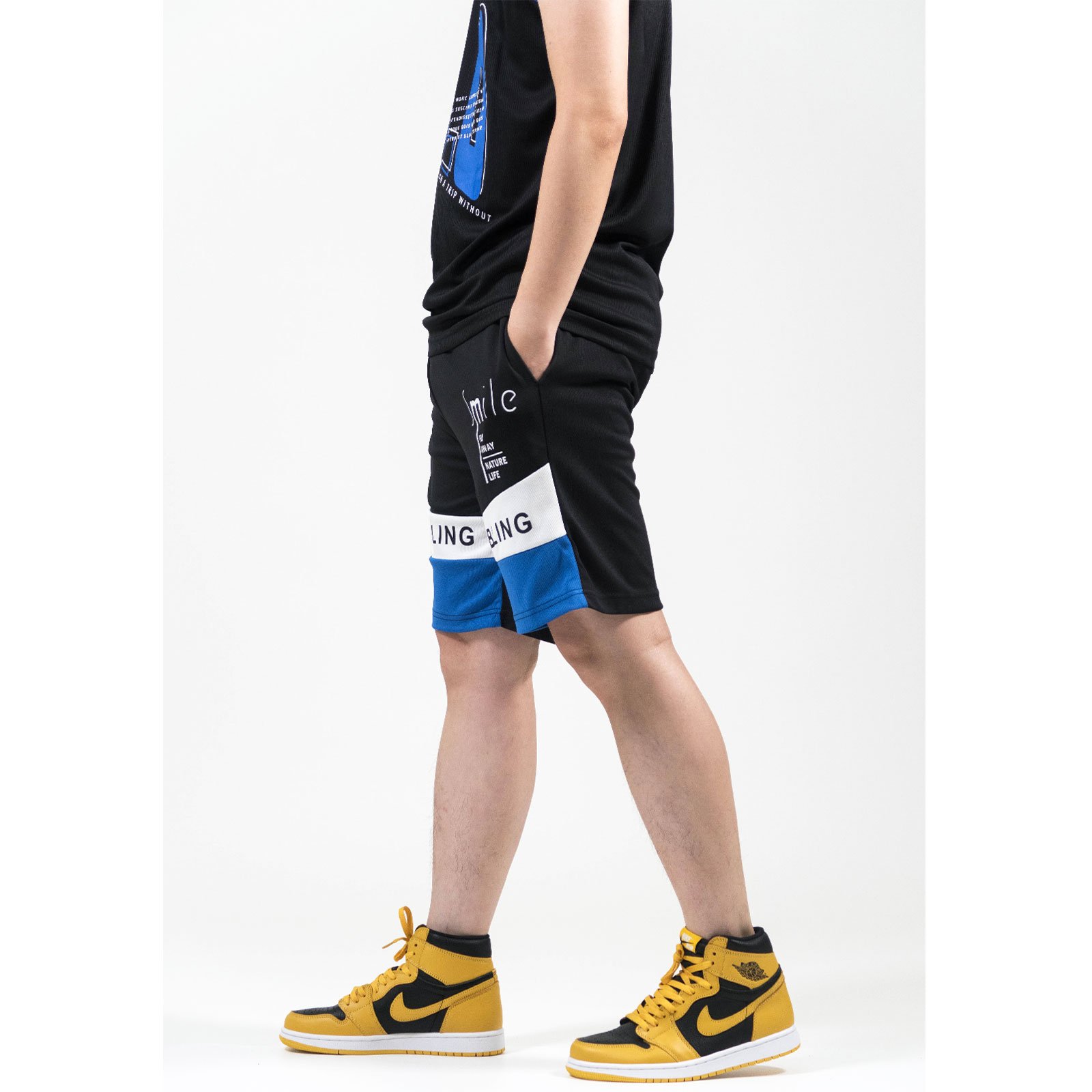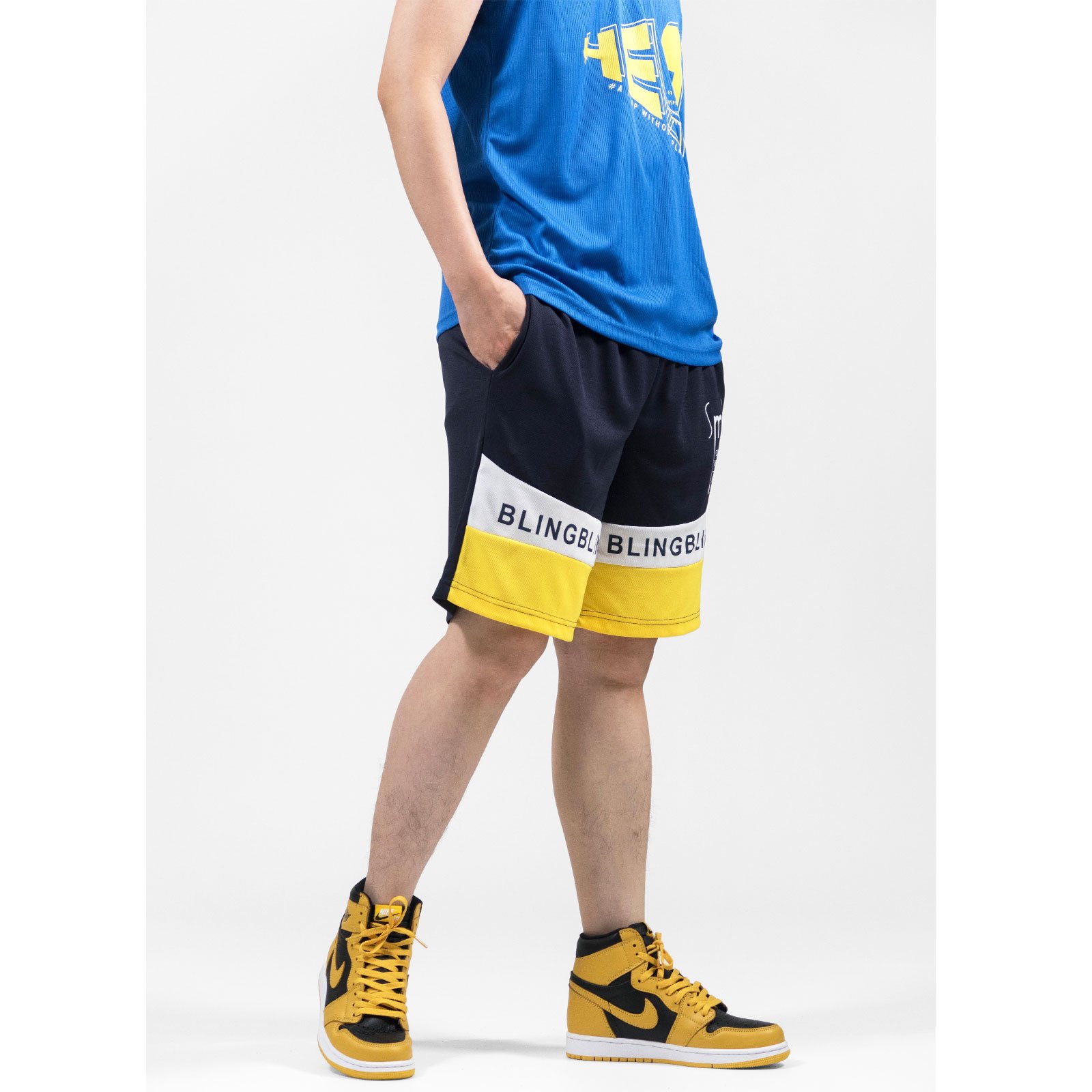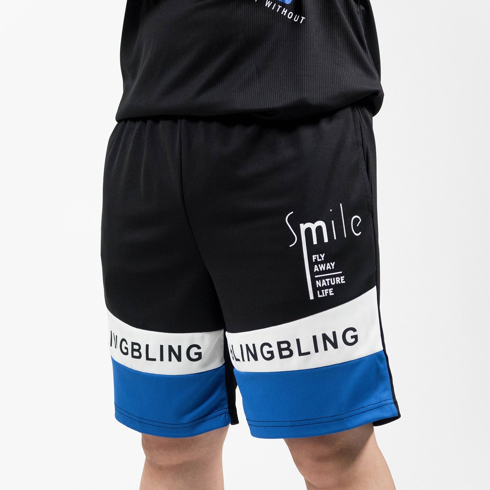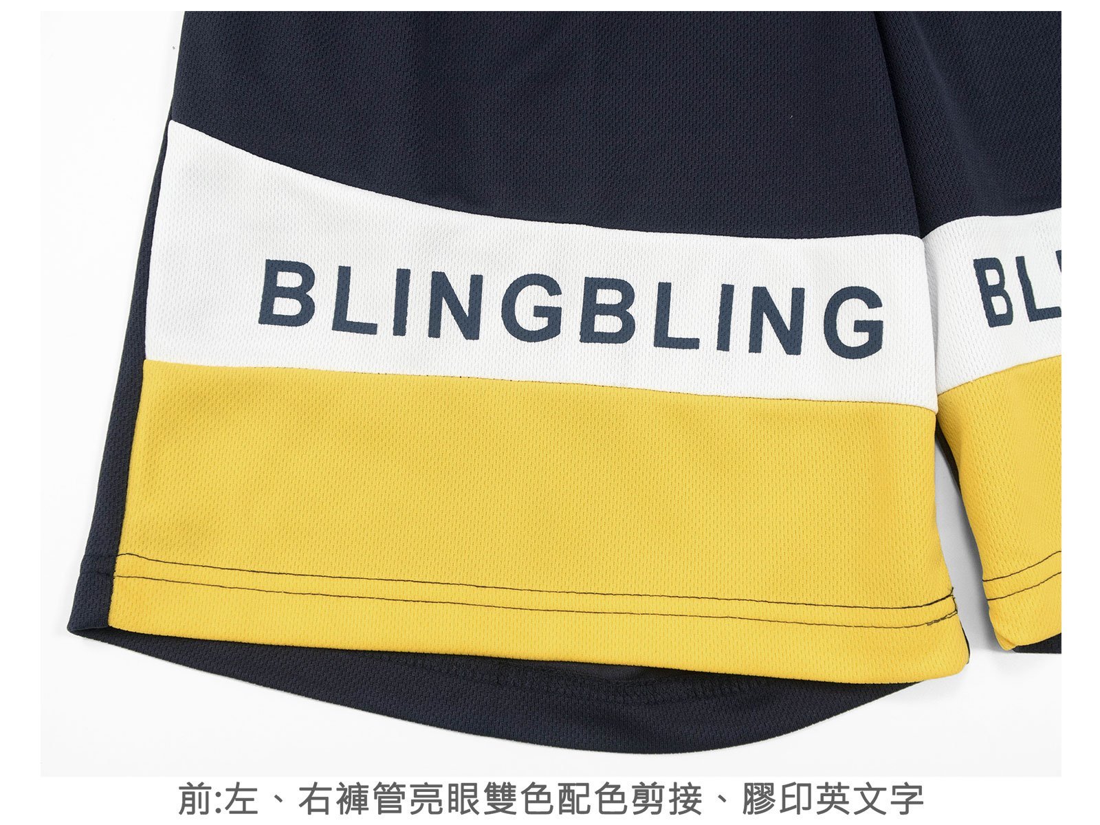 前左、右褲管亮眼雙色配色剪接、膠印英文字。