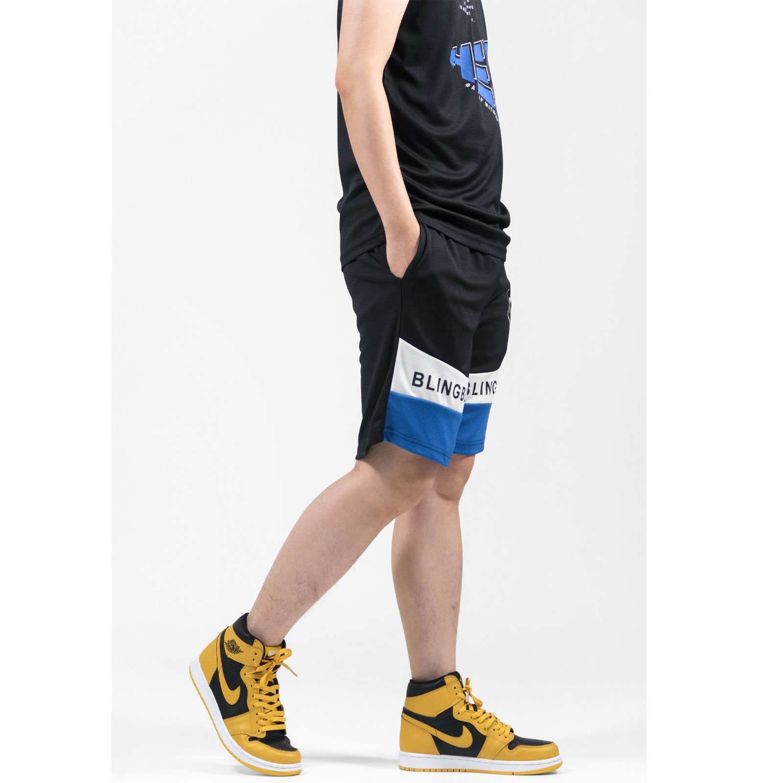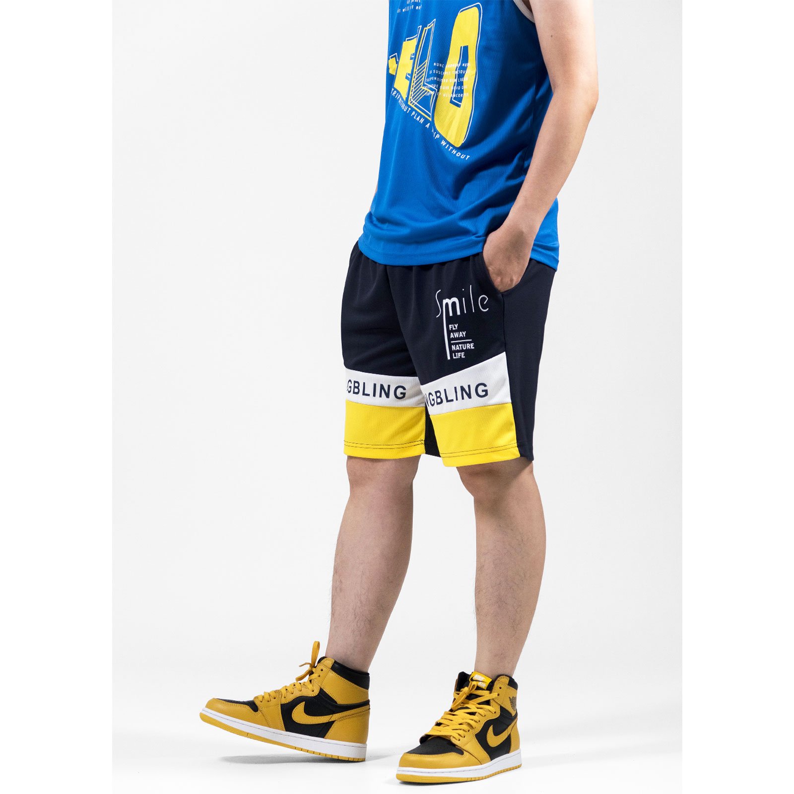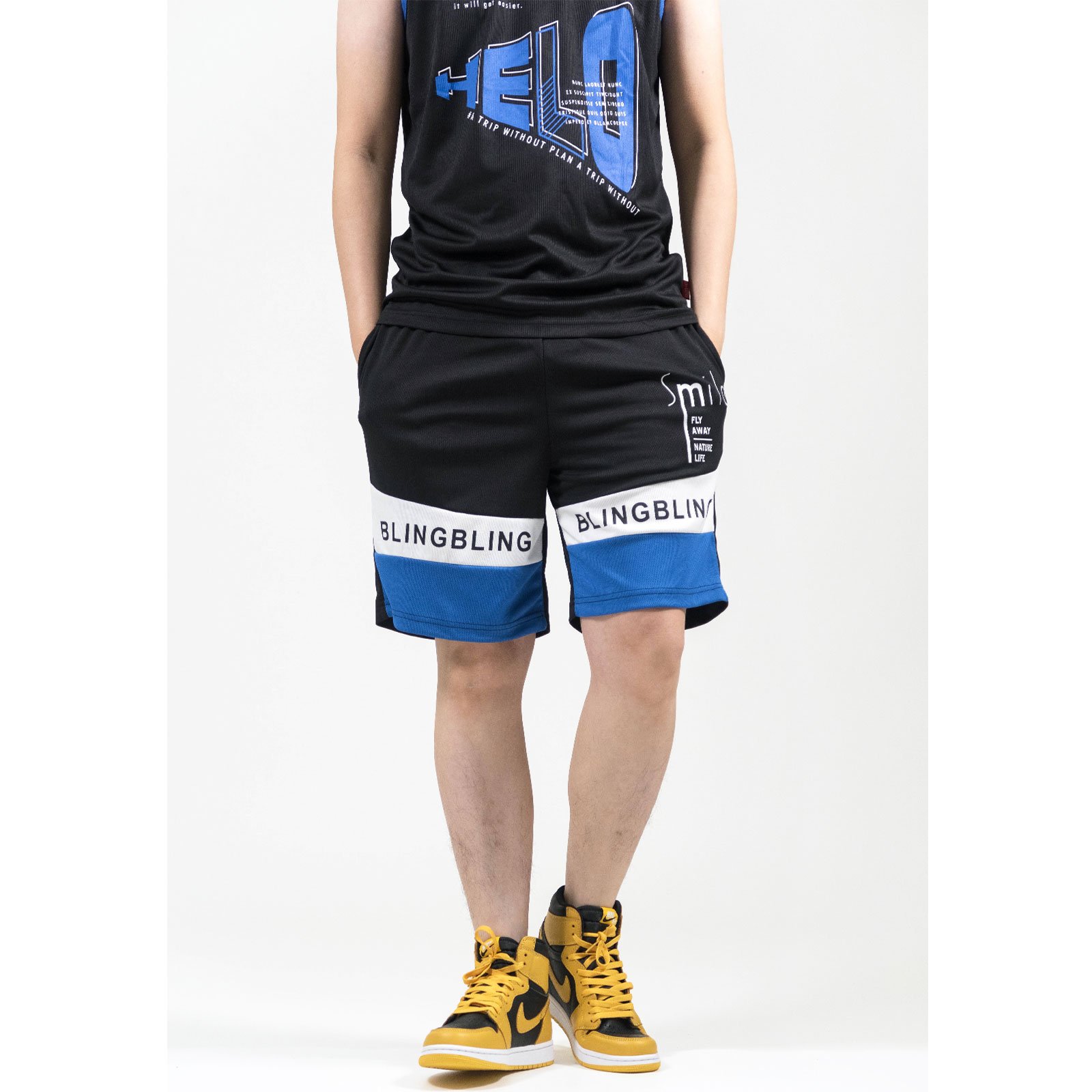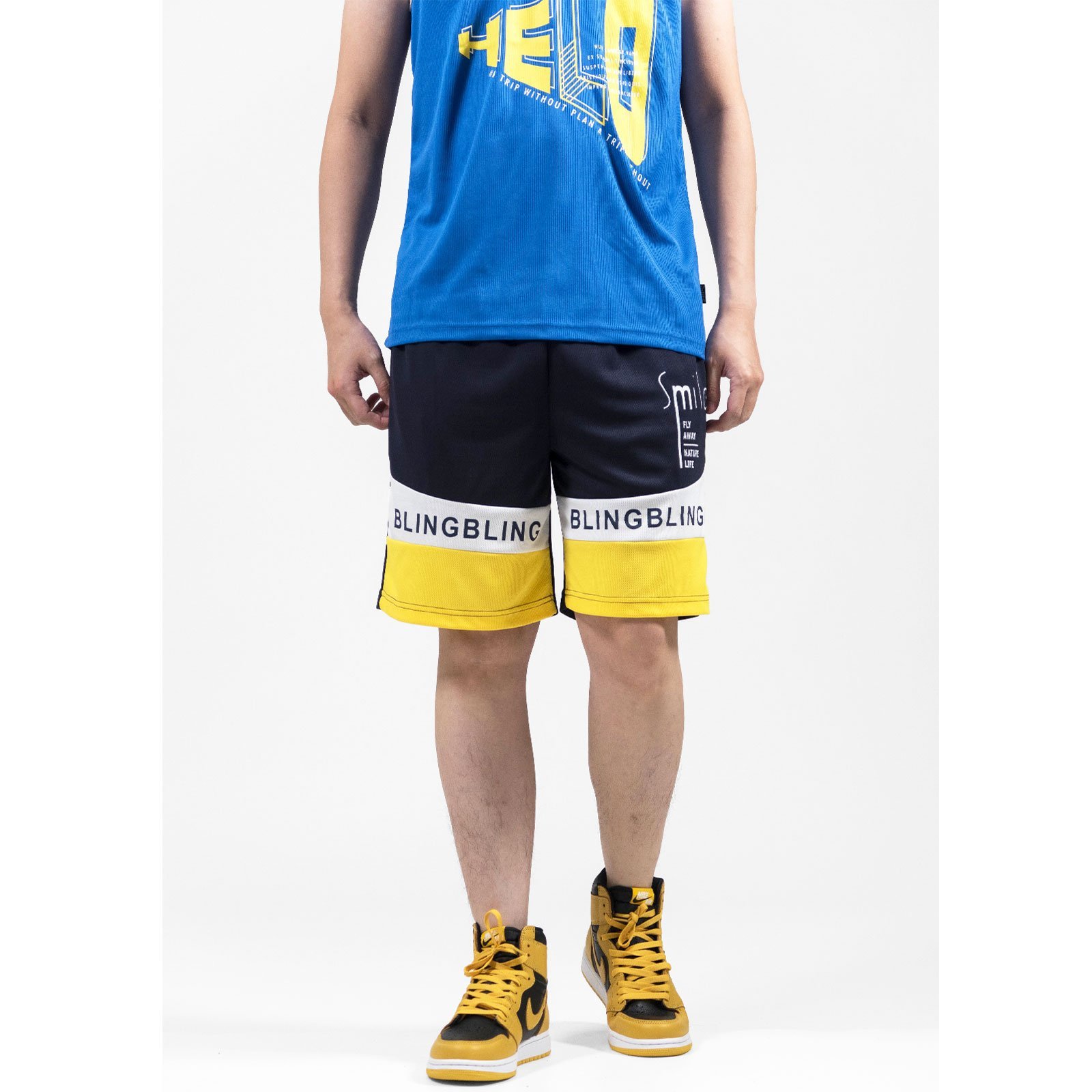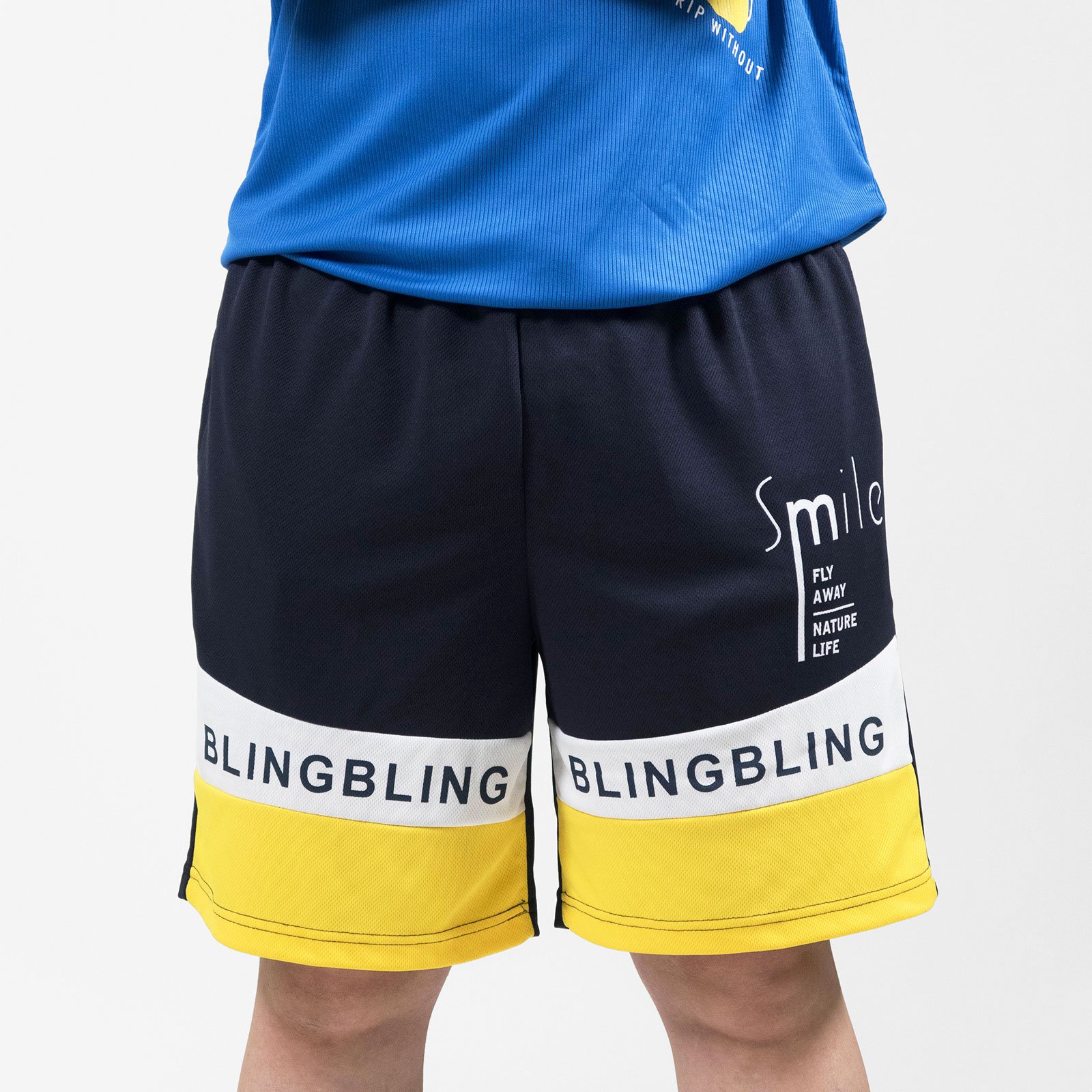 前左、右褲管亮眼雙色配色剪接、膠印英文字。
