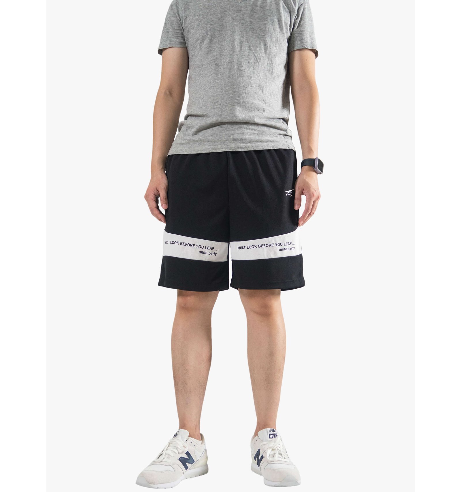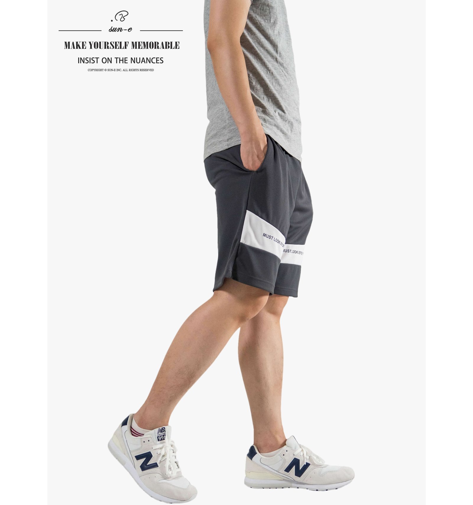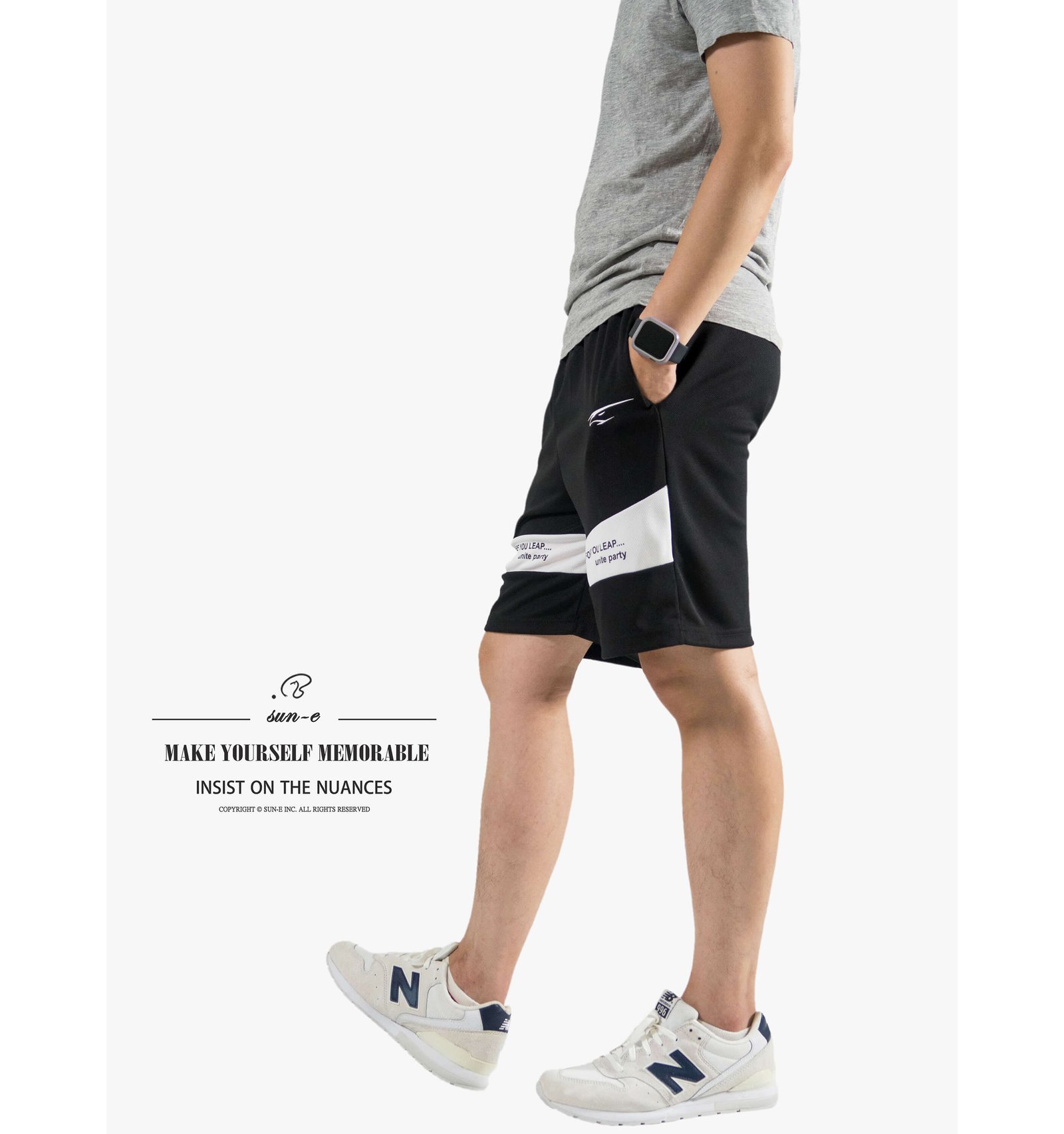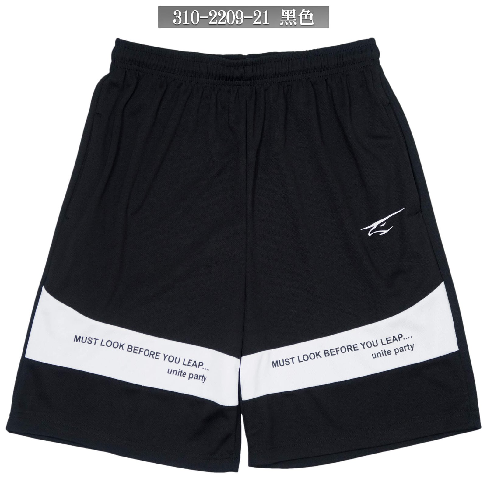 前褲管配色剪接、膠印英文字樣。