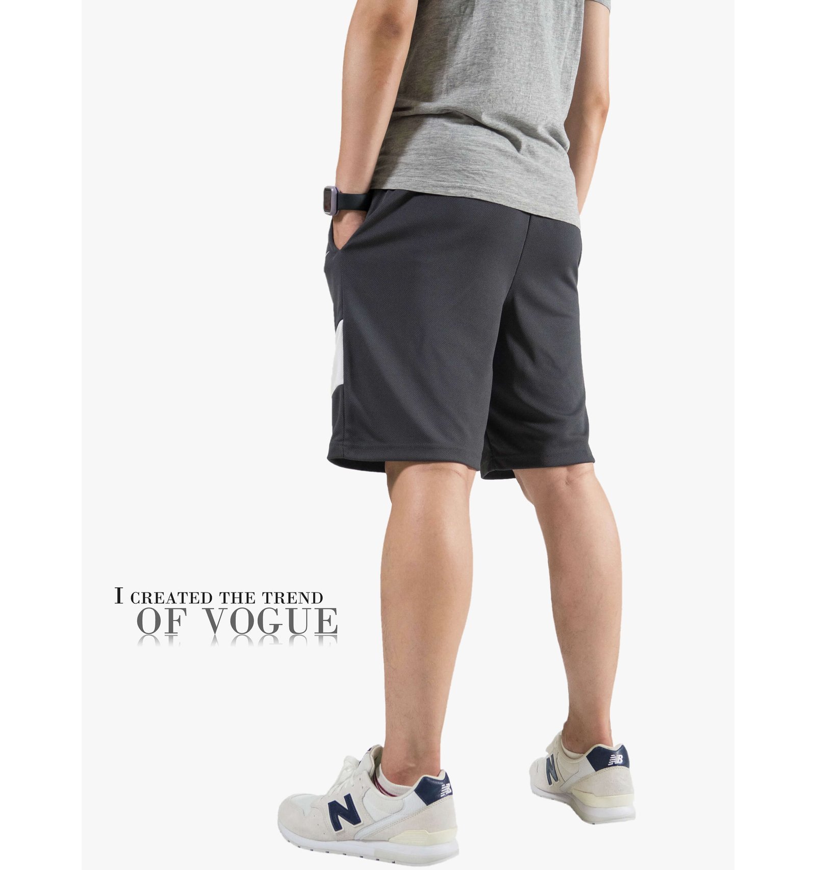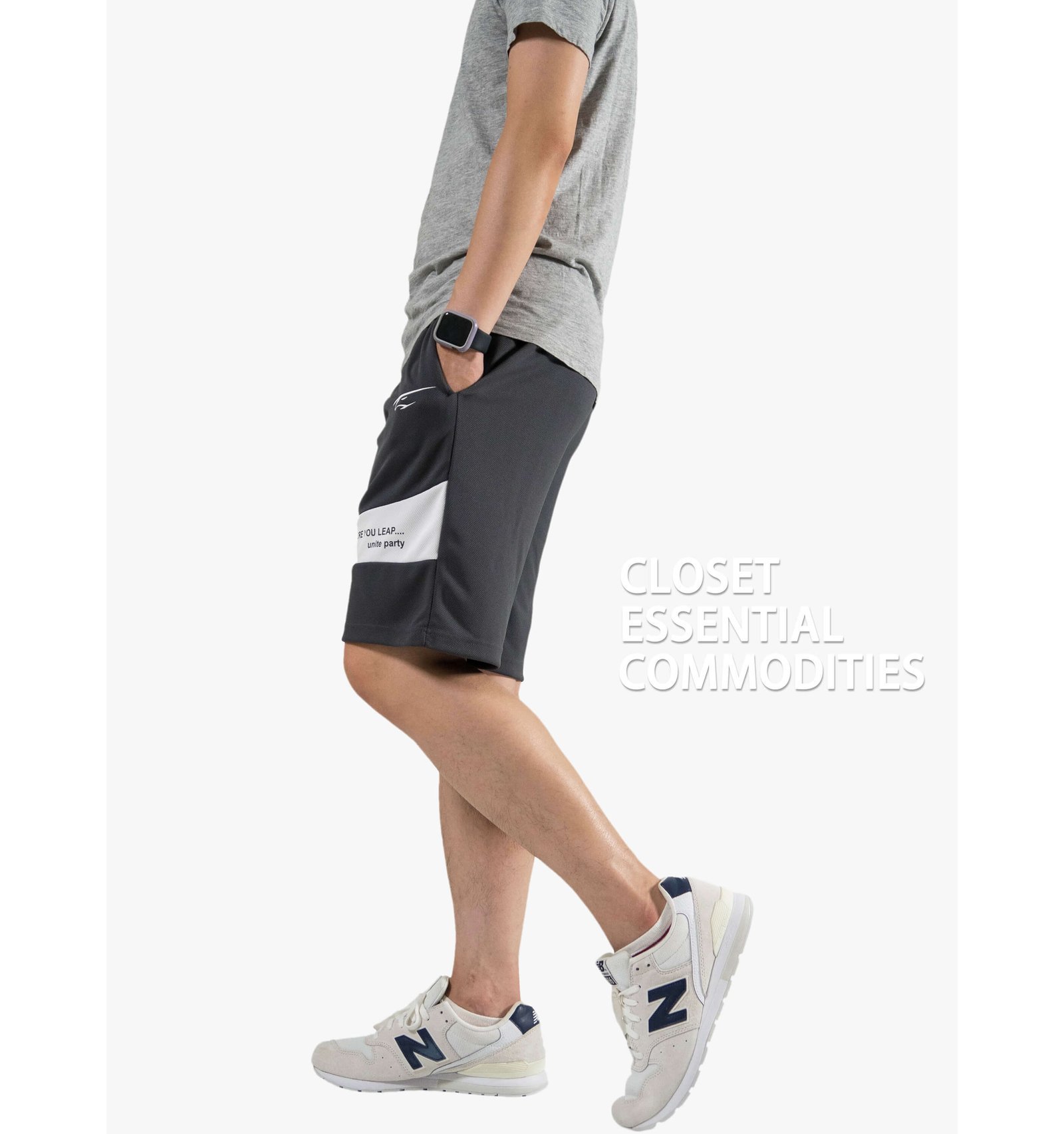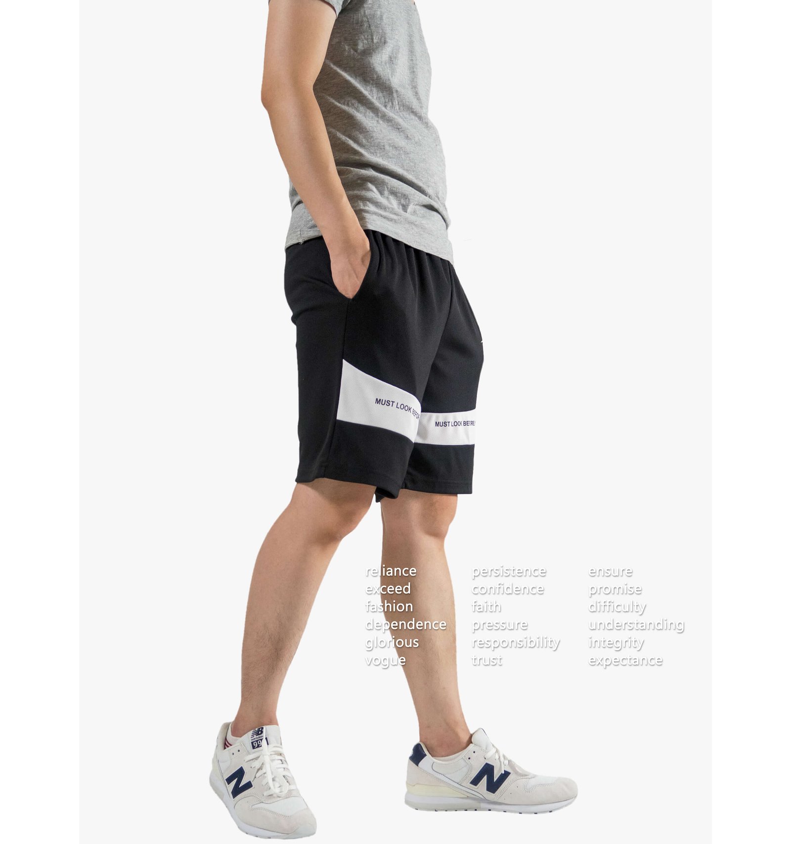 前褲管配色剪接、膠印英文字樣。