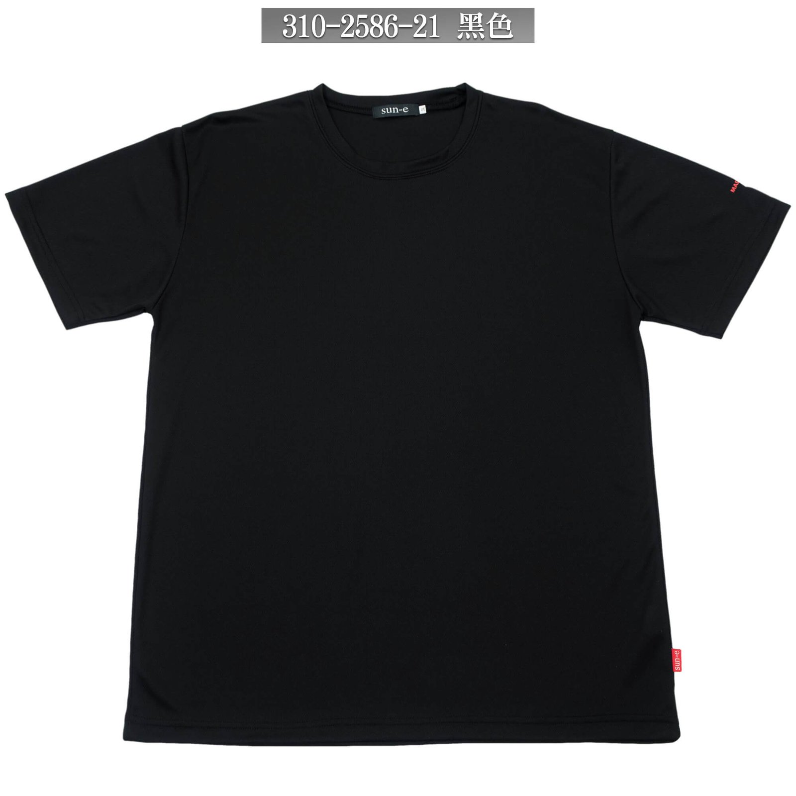 左袖口膠印台灣製圖樣、sun-e LOGO英文字樣。
