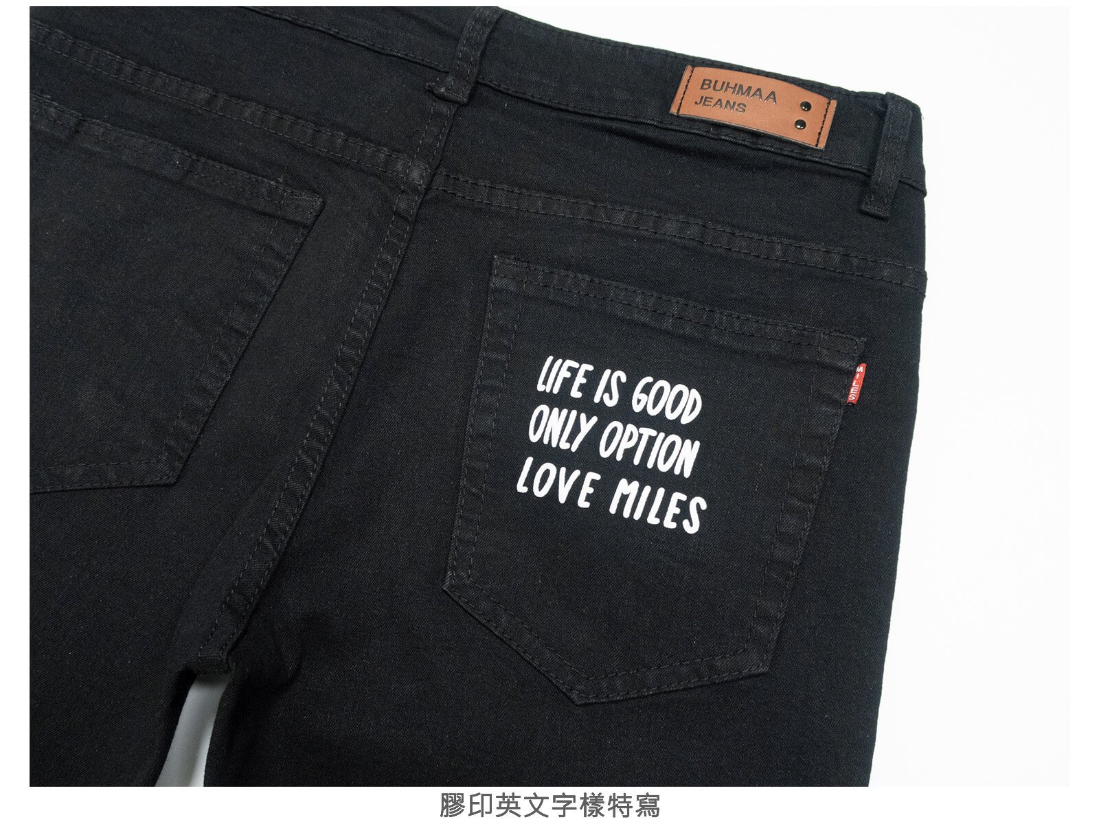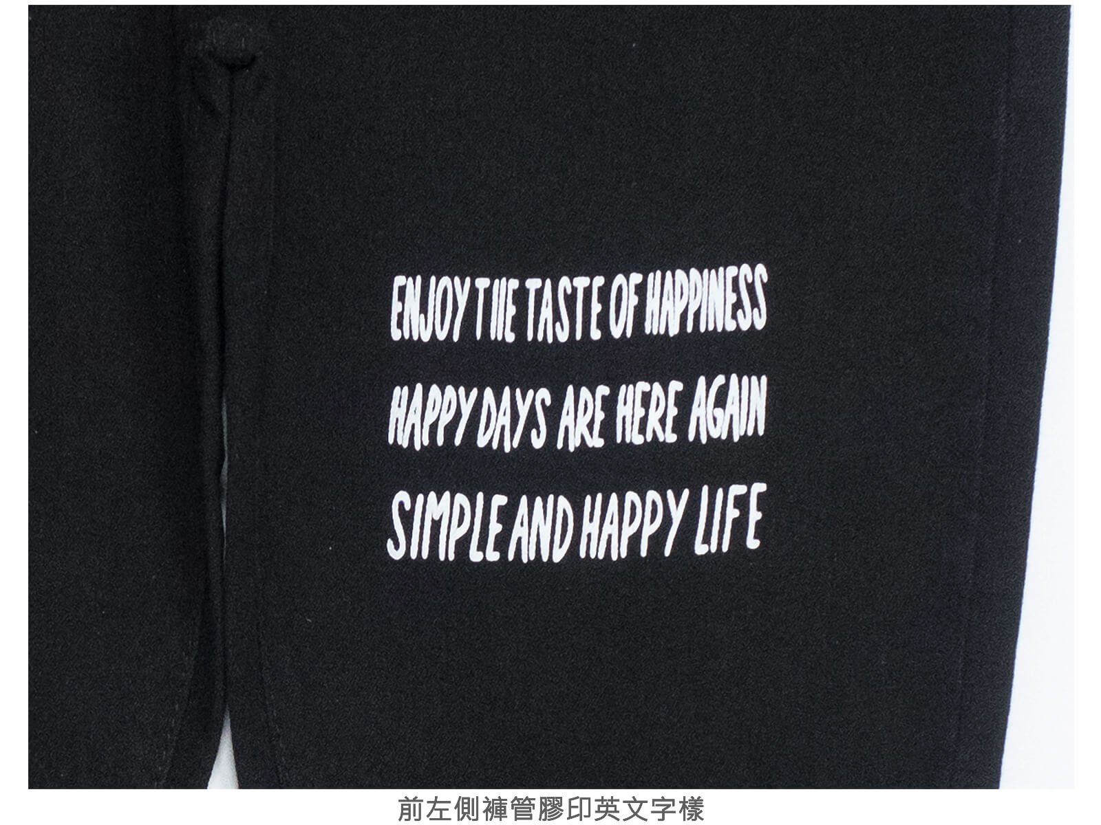 左側褲管膠印英文字樣。