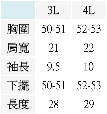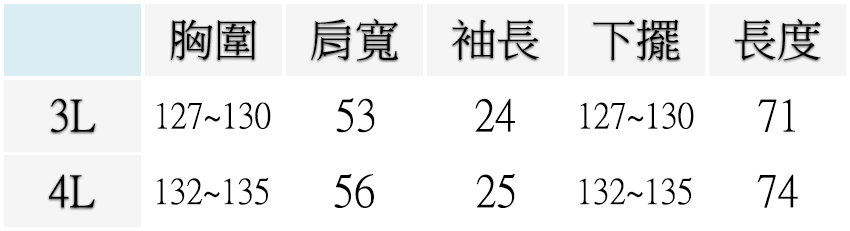3L ( 胸圍50~51英吋 / 127~130公分 ), 4L ( 胸圍52~53英吋 / 132~135公分 )