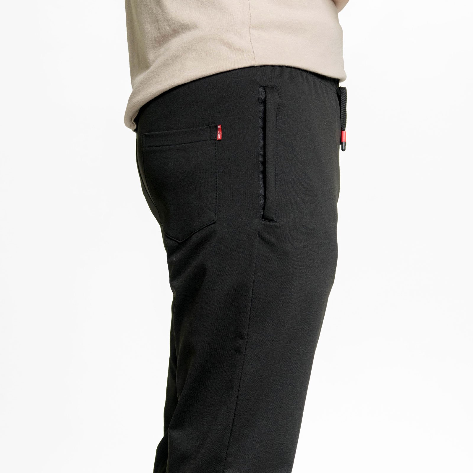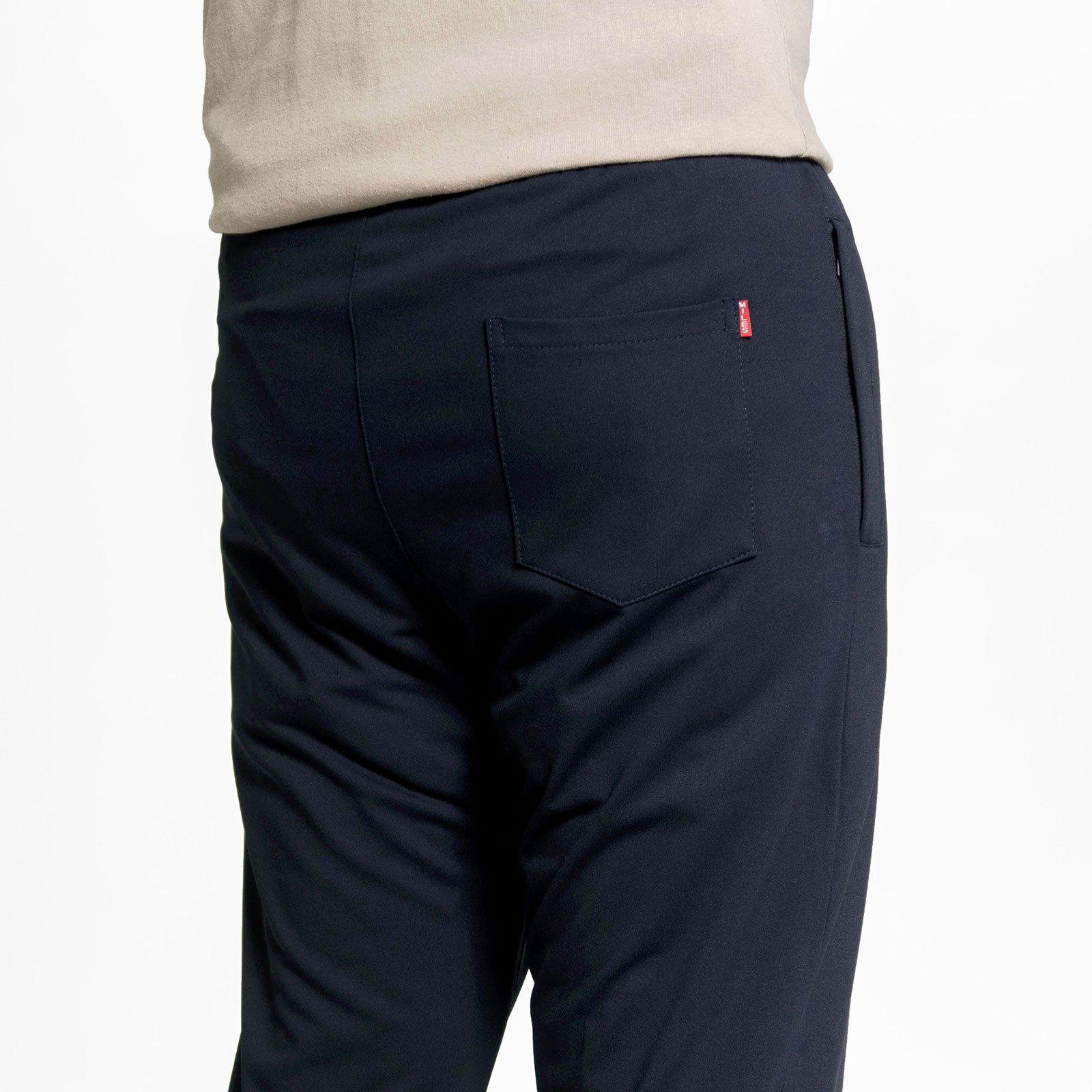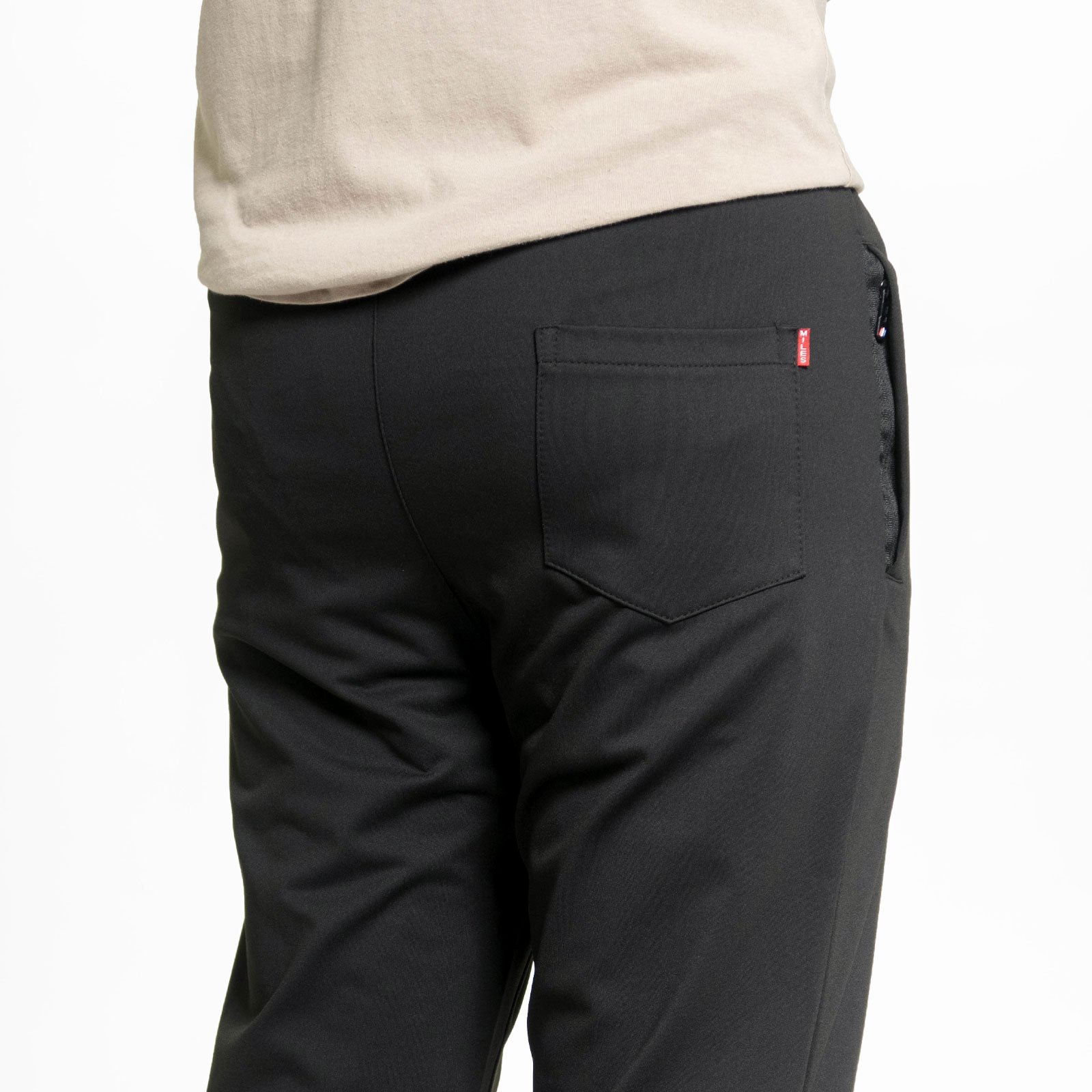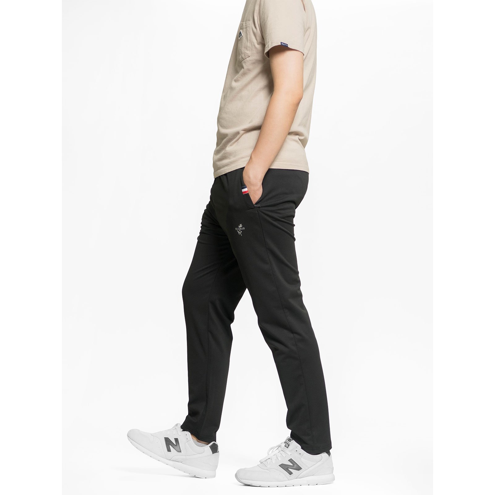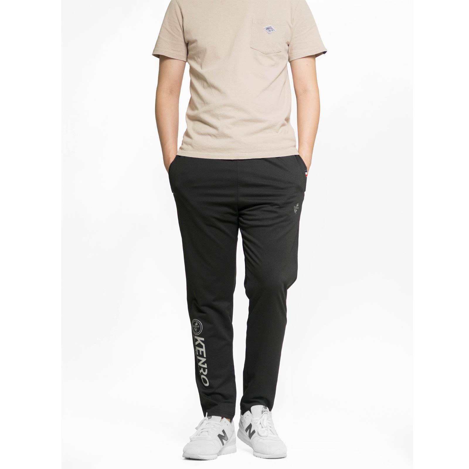 前右褲管下側膠印英文字。