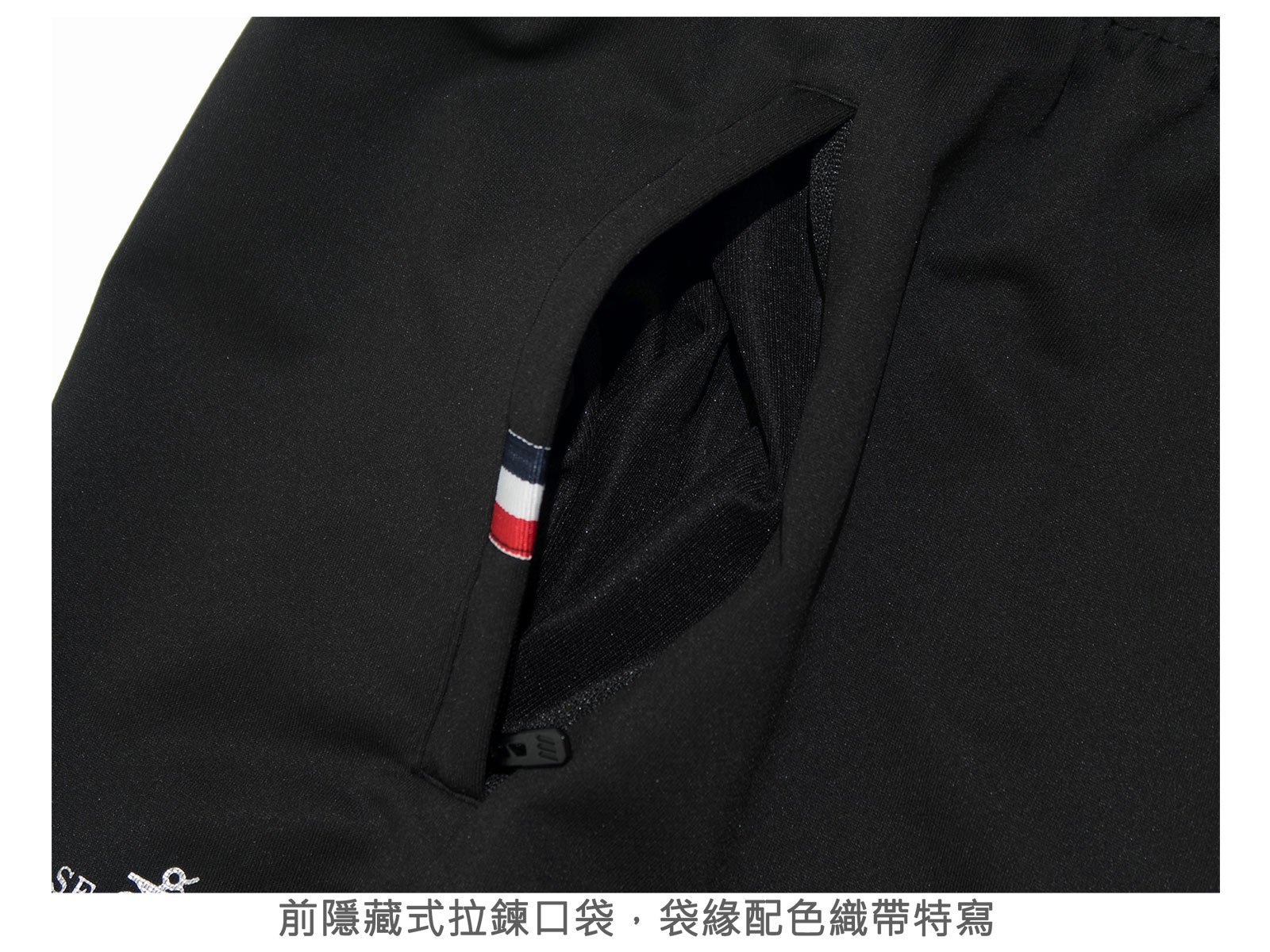 前:左、右各一隱藏式拉鍊口袋,袋緣配色織帶。